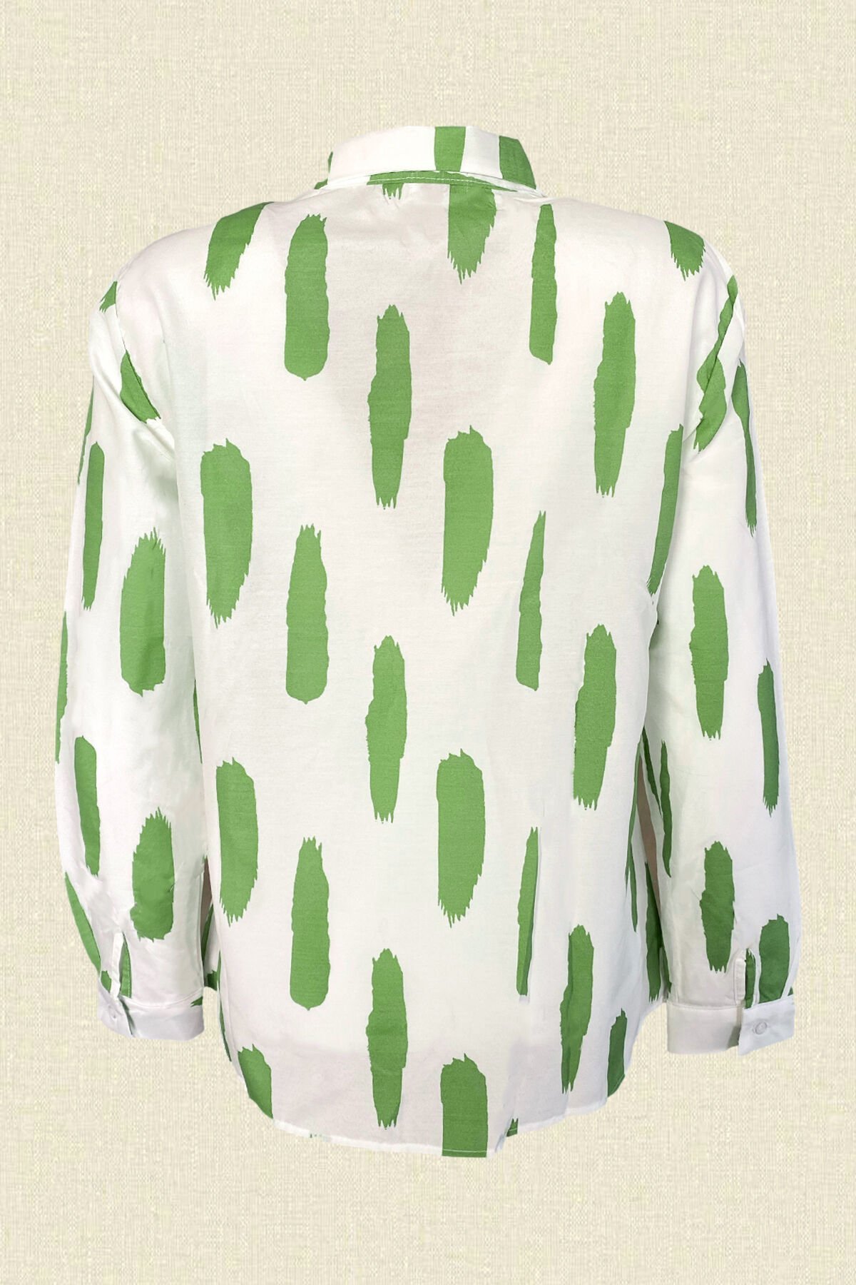 Gömleğin ön kısmında renkli boncuklardan kalem işlemesi bulunan, kendinden yeşil desenleri bulunan beyaz gömlek.