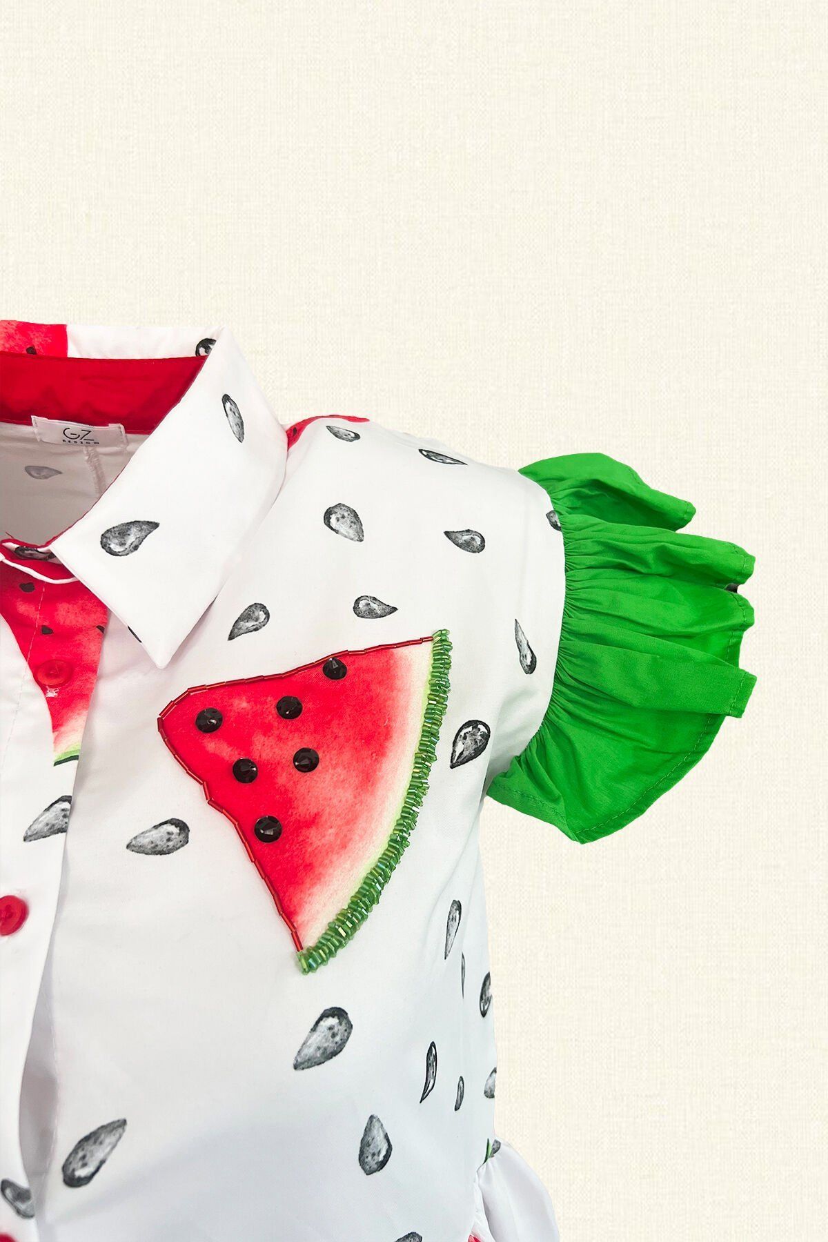 Elbisenin ön kısmında karpuz işlemesi bulunan, ön kısmı düğmeli, kolları fırfırlı elbise.