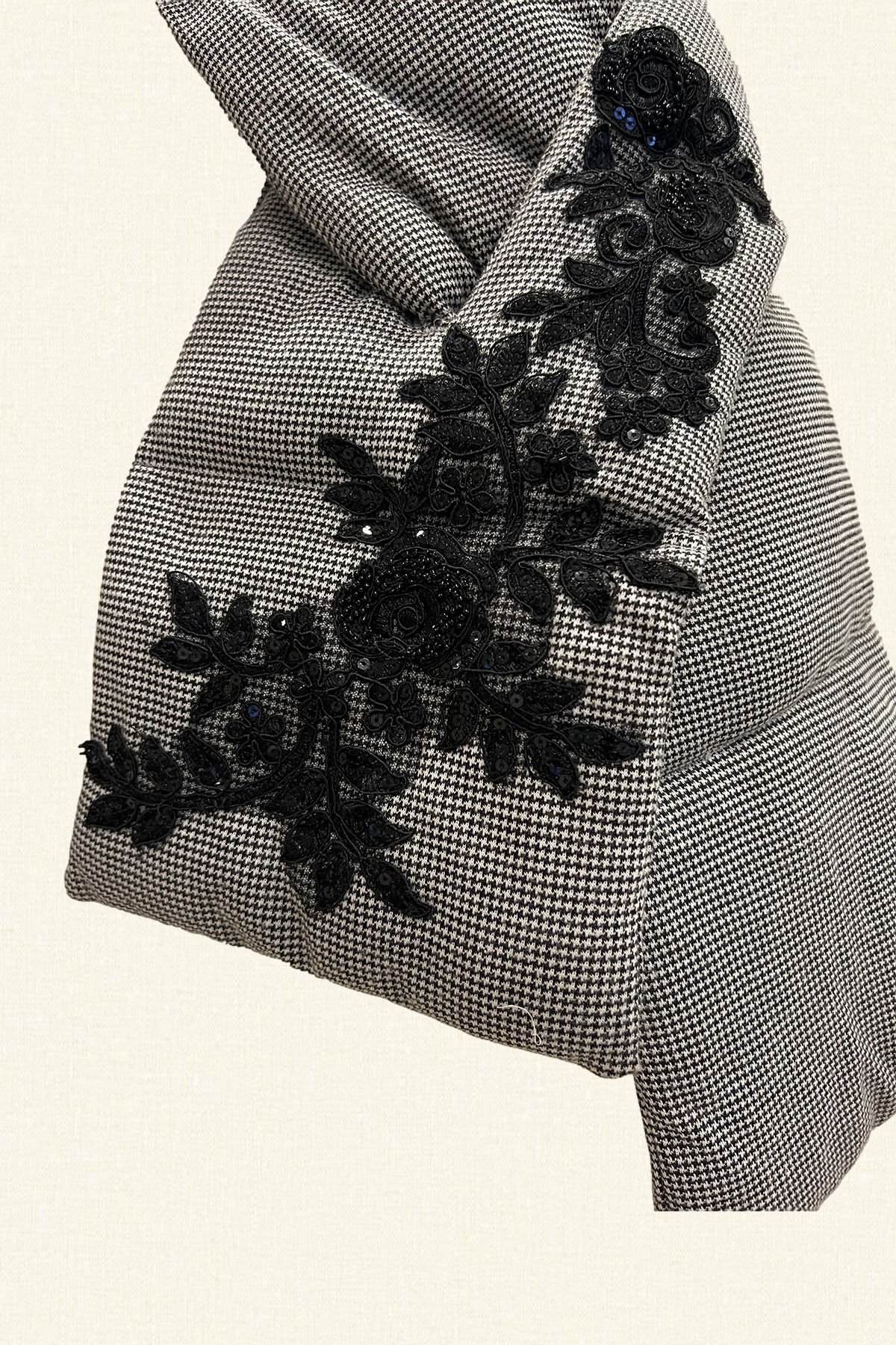 Kazayağı Desenli Siyah Çiçek İşlemeli Atkı