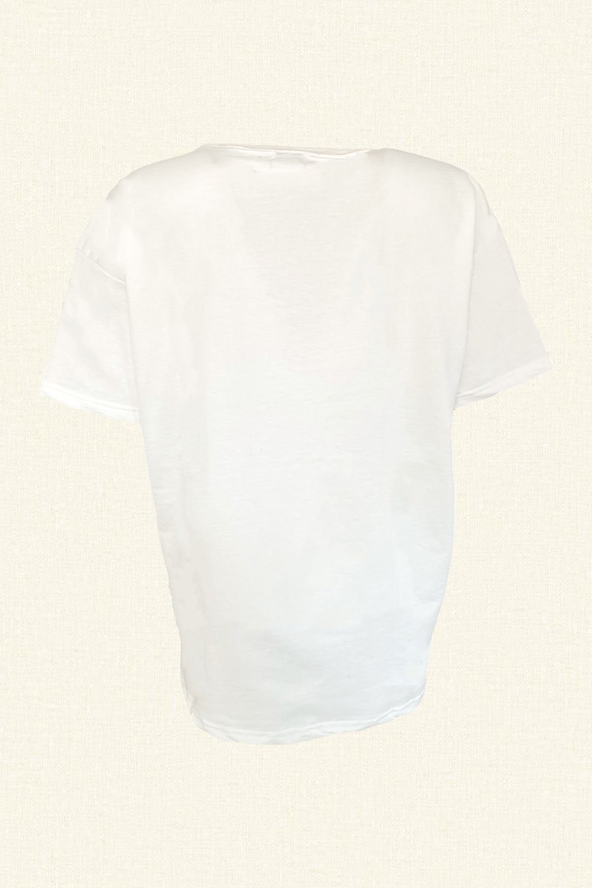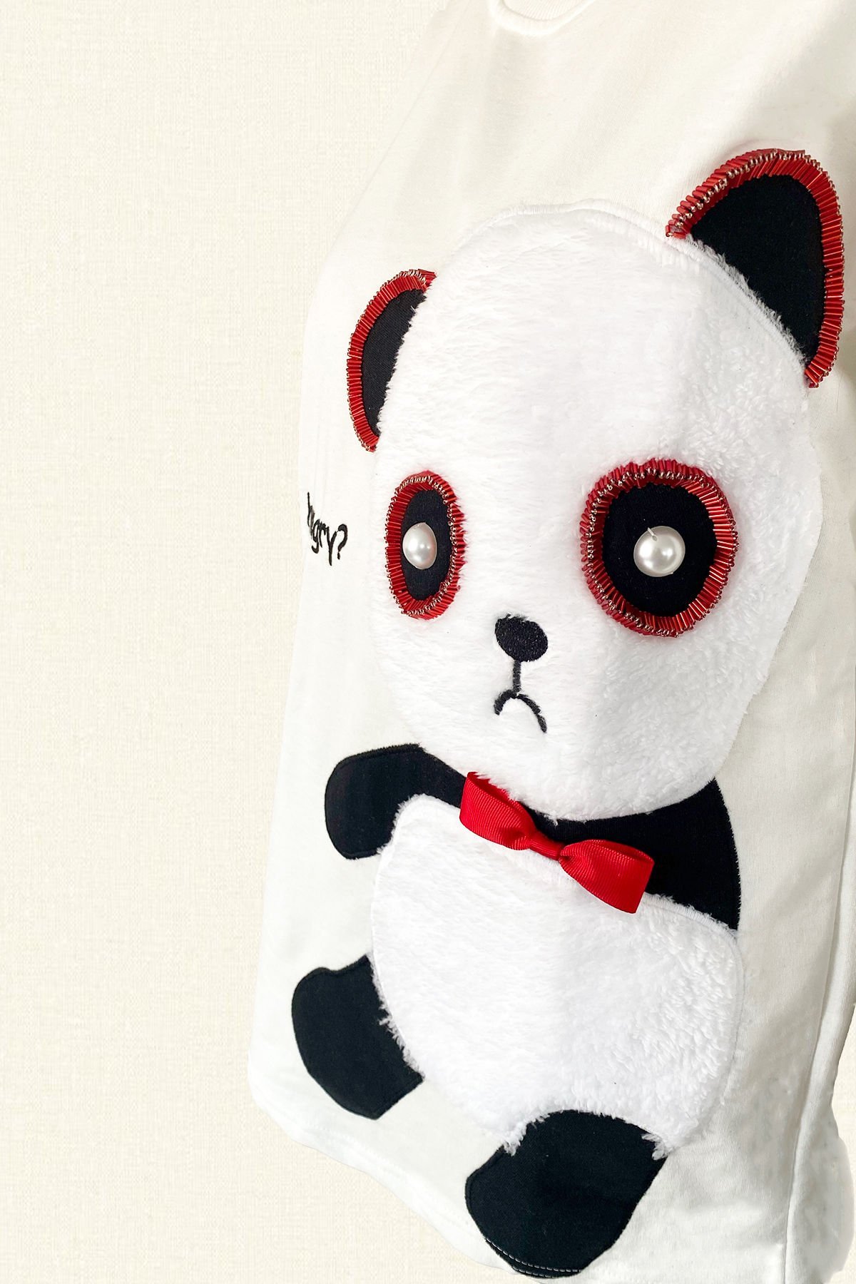 Ön kısmında kırmızı boncuklardan işlemesi bulunan, tüylü panda detaylı beyaz oversize tişört.