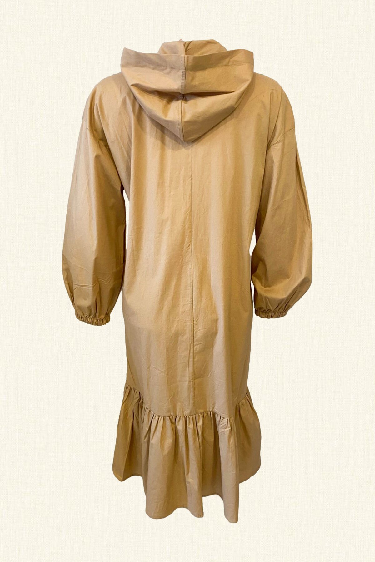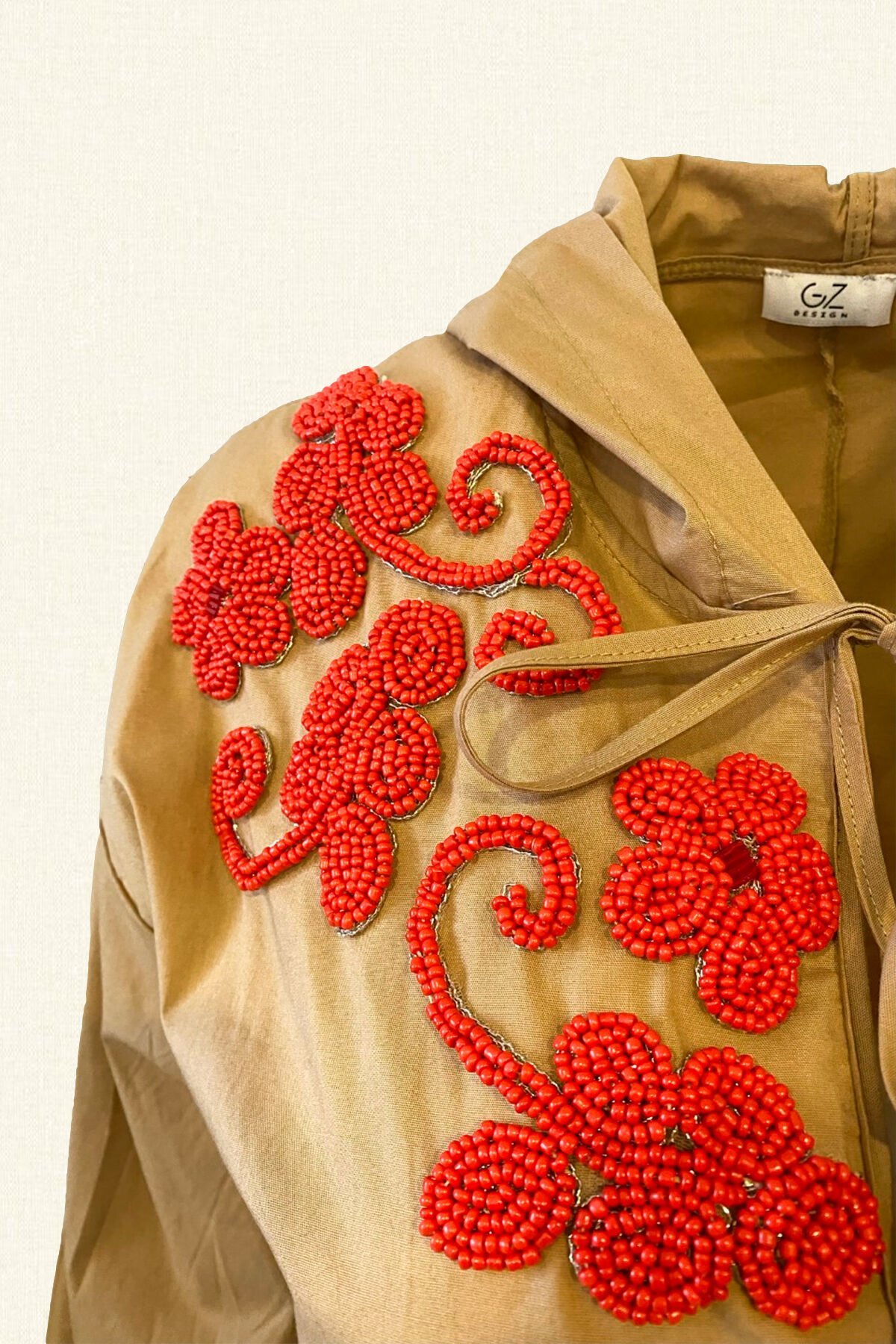 Önü kırmızı boncuk işleme detaylı kapüşonlu krem rengi gömlek elbise.