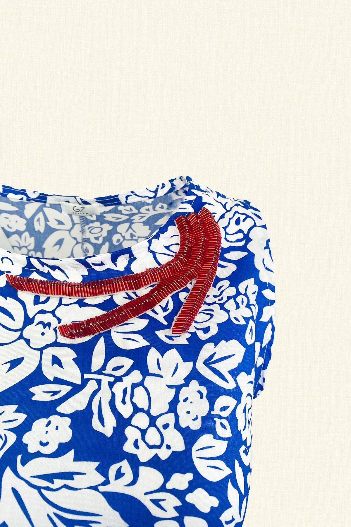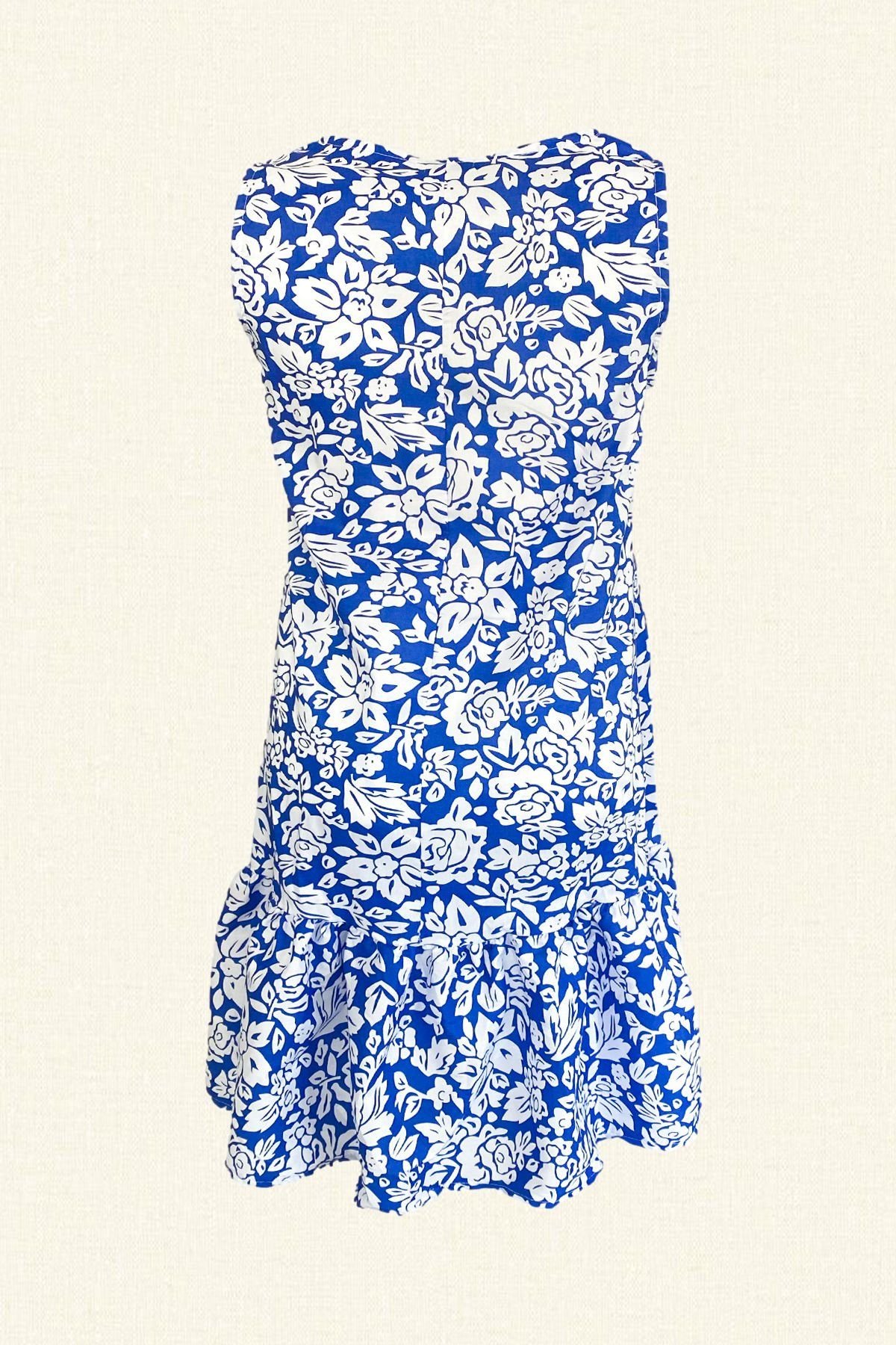 Yakasında kırmızı boncuklardan işlemesi bulunan, beyaz çiçekli, eteği fırfır detaylı mavi elbise.