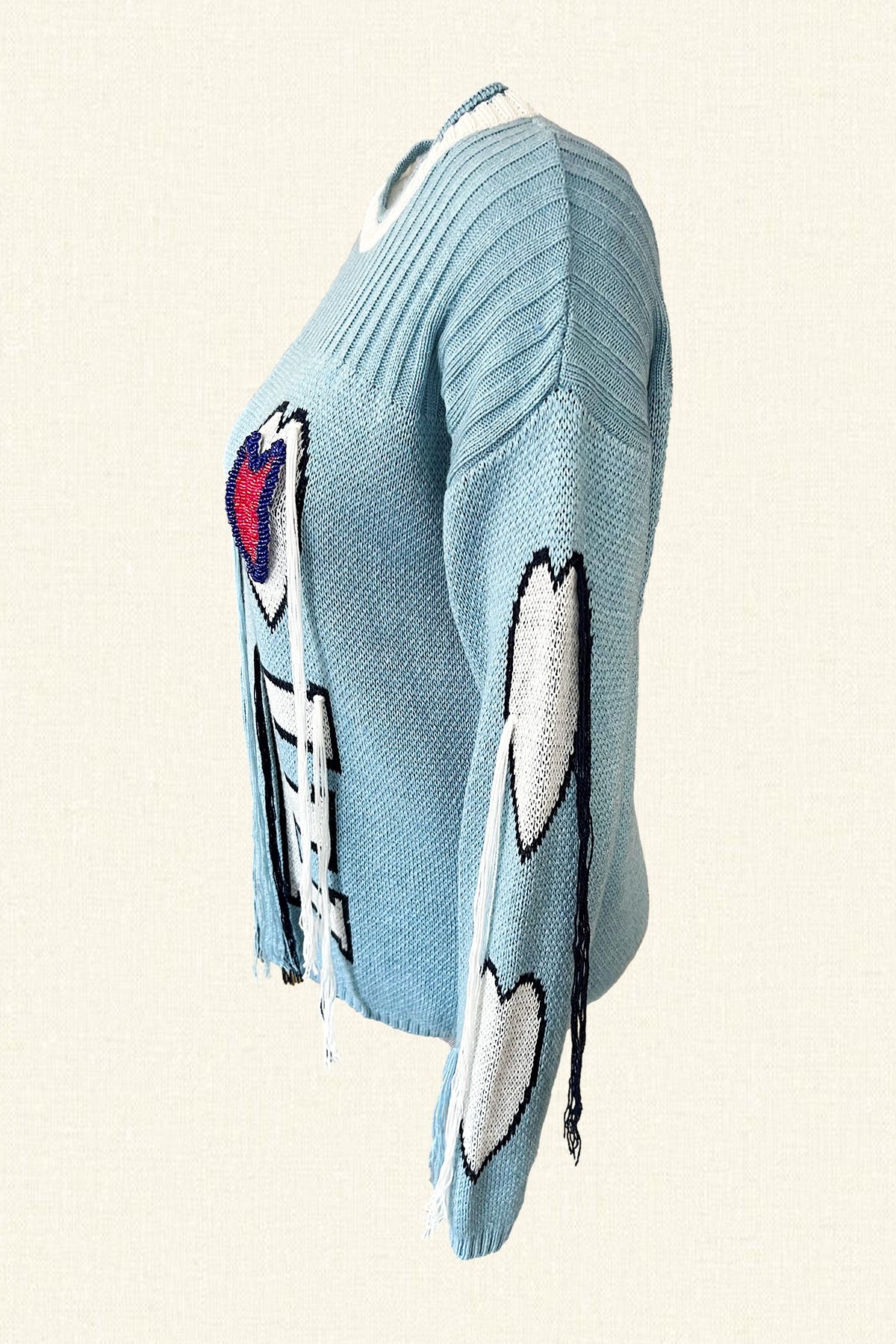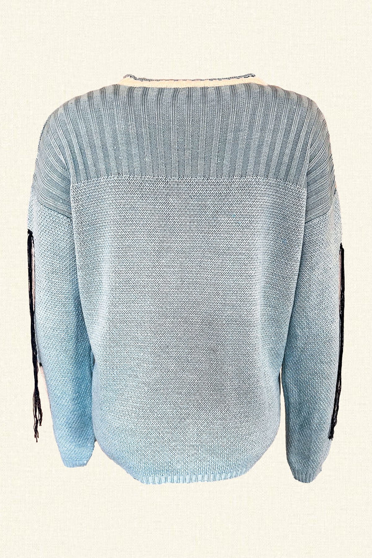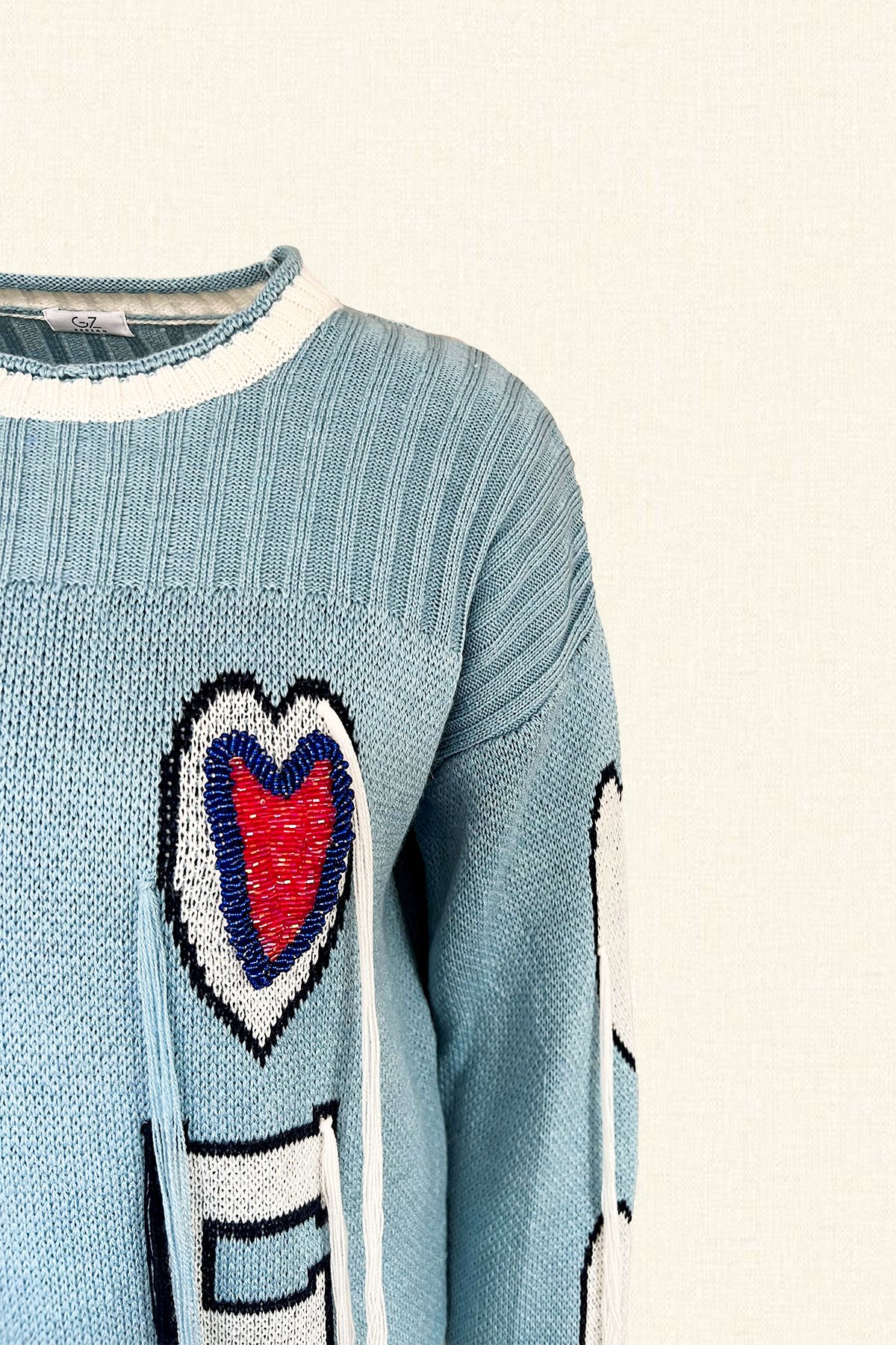 Ön kısmında ve kollarında yazı ve kalp şekli bulunan, kalp kısmı boncuklardan işlemeli, püskül detaylı mavi kazak.