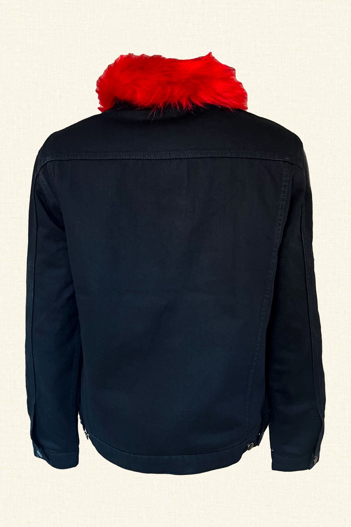 Kırmızı Kürklü Boncuk Püskül Detaylı Siyah Jean Ceket