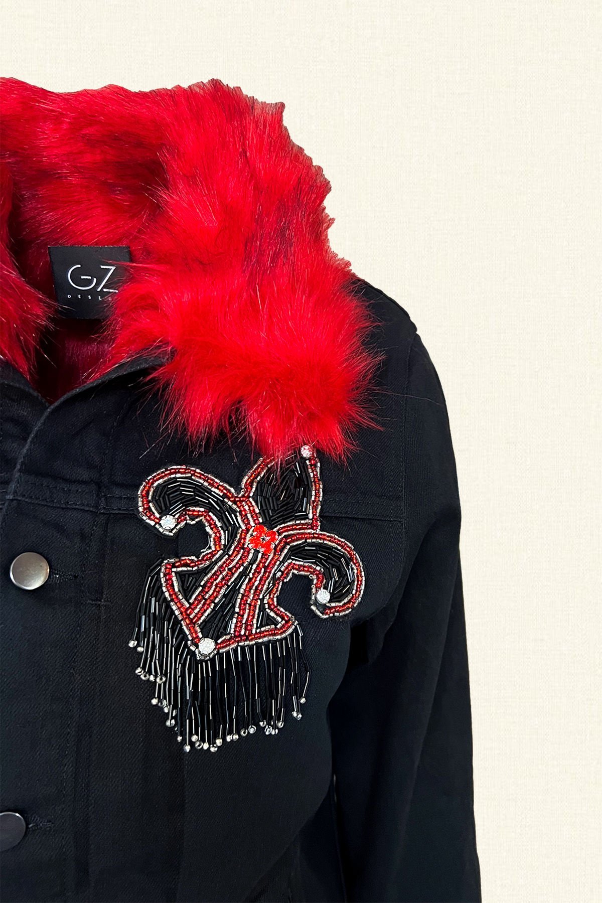 Ön kısmında kırmızı, siyah boncuk ve kristallerden boncuk işlemeli, püskül detaylı ve içi kırmızı suni kürklü, iç tarafında kolları kapitone siyah renk jean ceket.