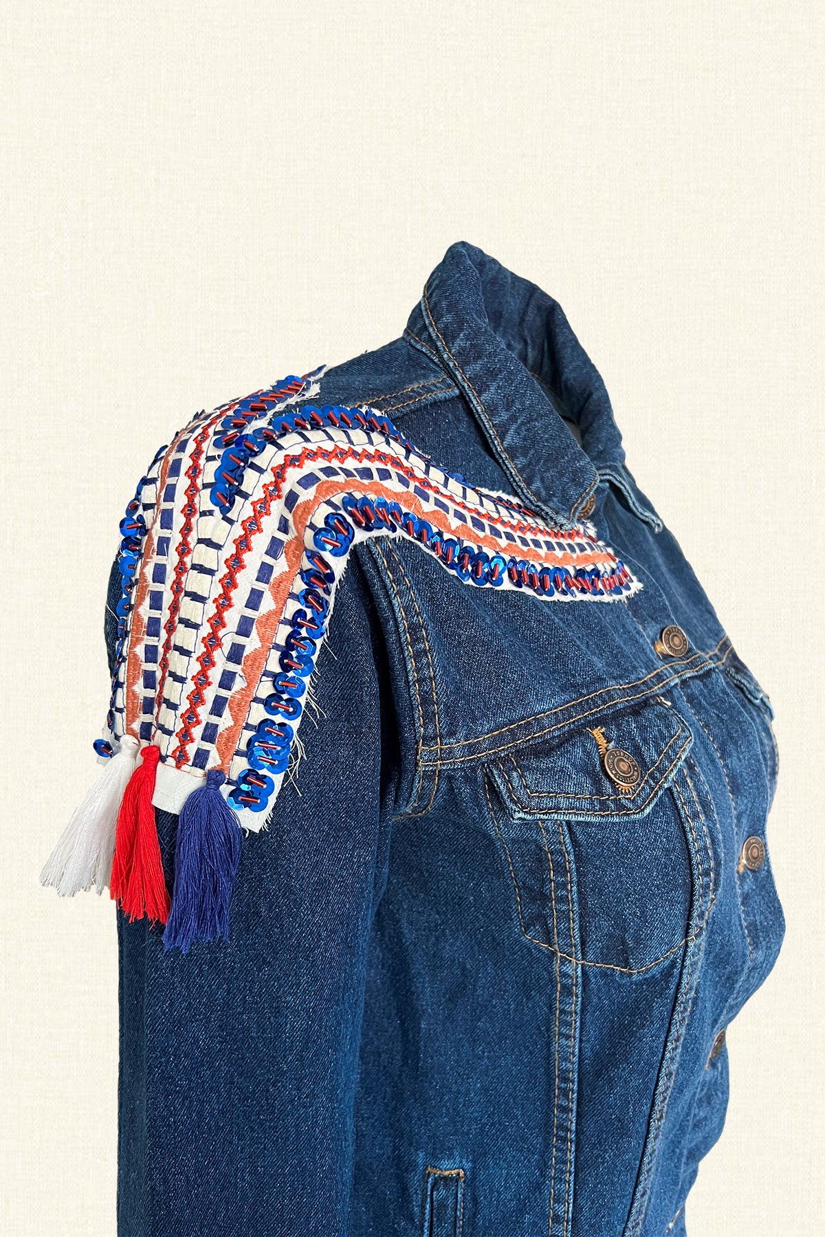 Yaka kısmının ön ve arkasında mavi, kırmızı, beyaz detaylı, boncuklardan işlemeli, püsküllü, koyu renk jean ceket.