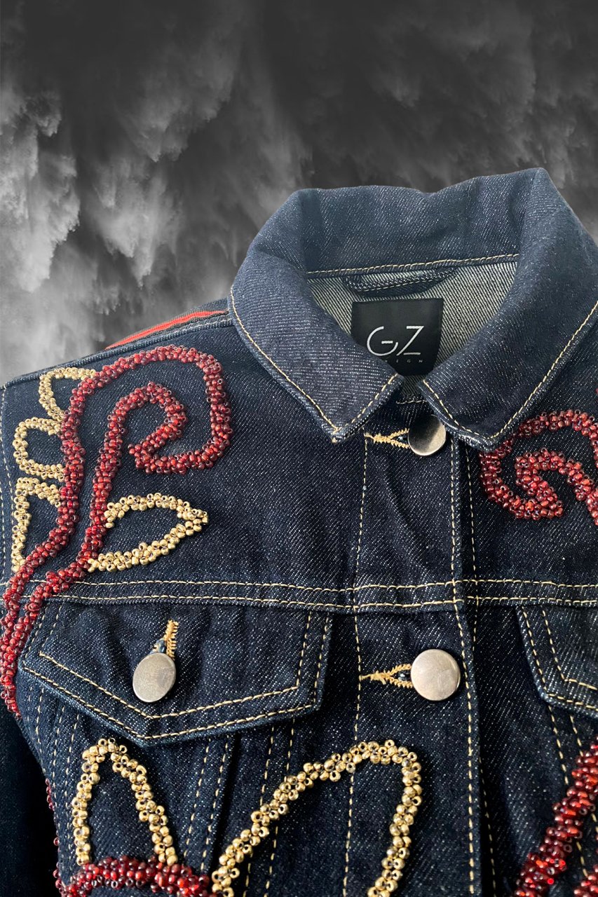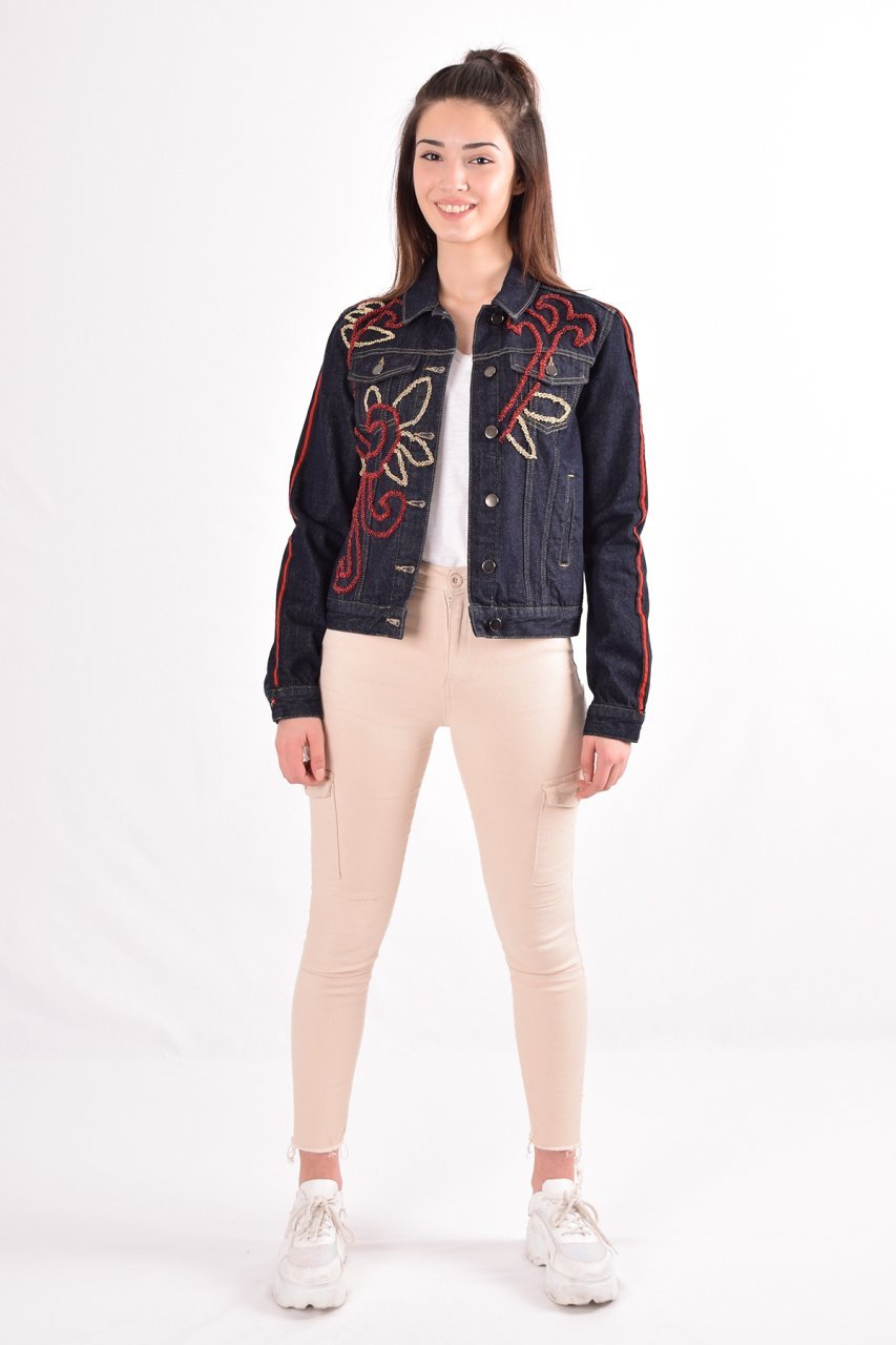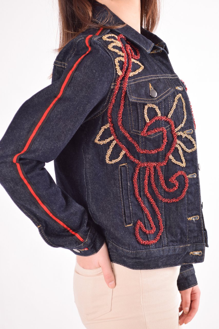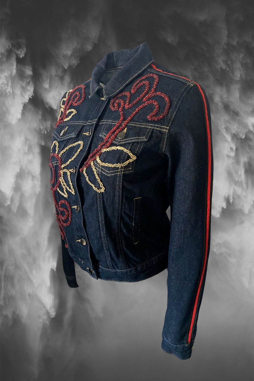 Kolları kırmızı şeritli, siyah ve gold renk boncuk detaylı koyu renk kot ceket.