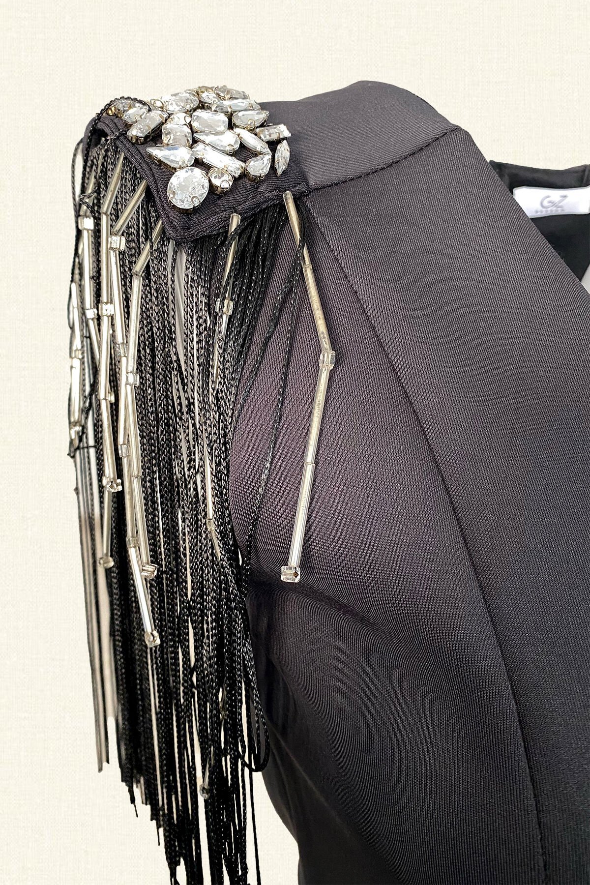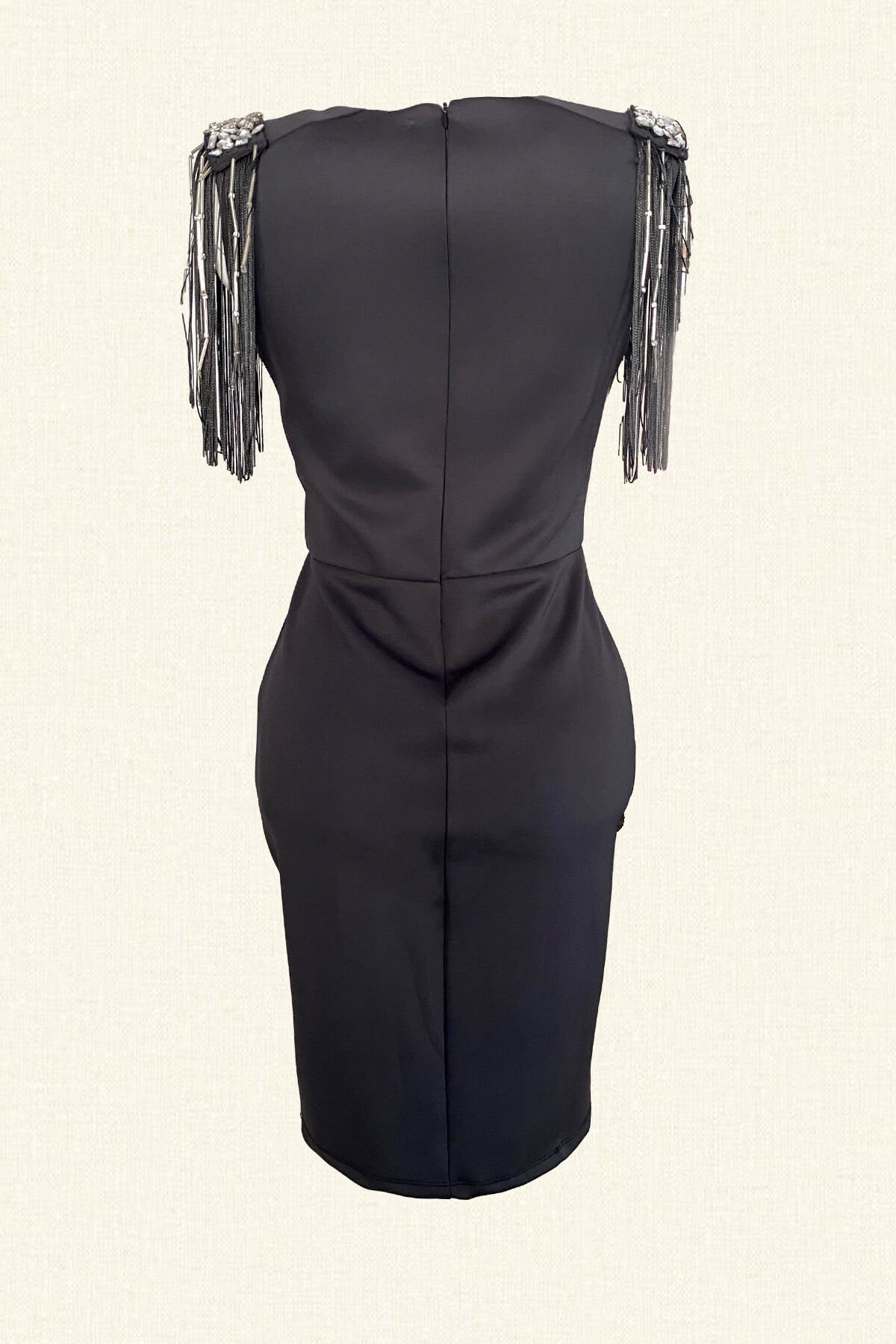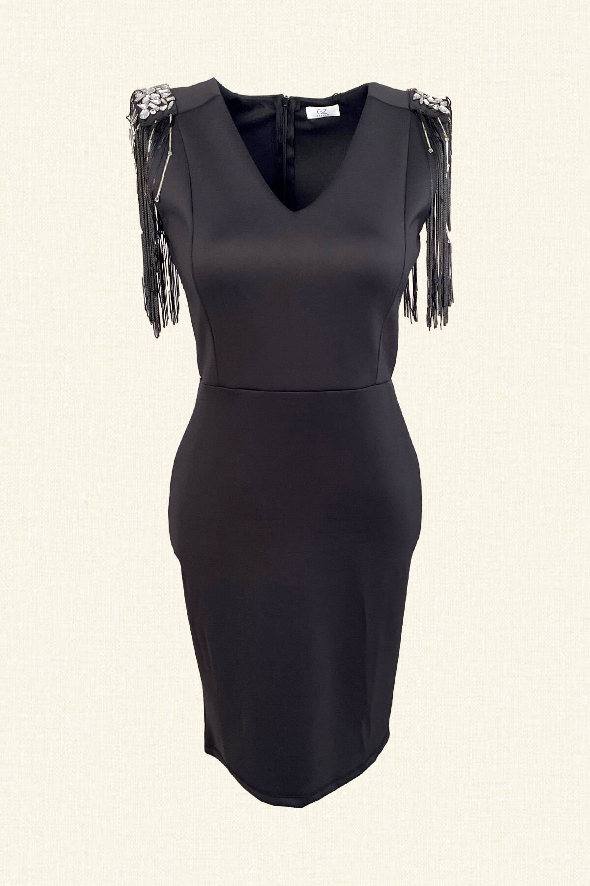 Kolları kristal taş ve püskül boncuk işlemeli likralı siyah mini elbise.