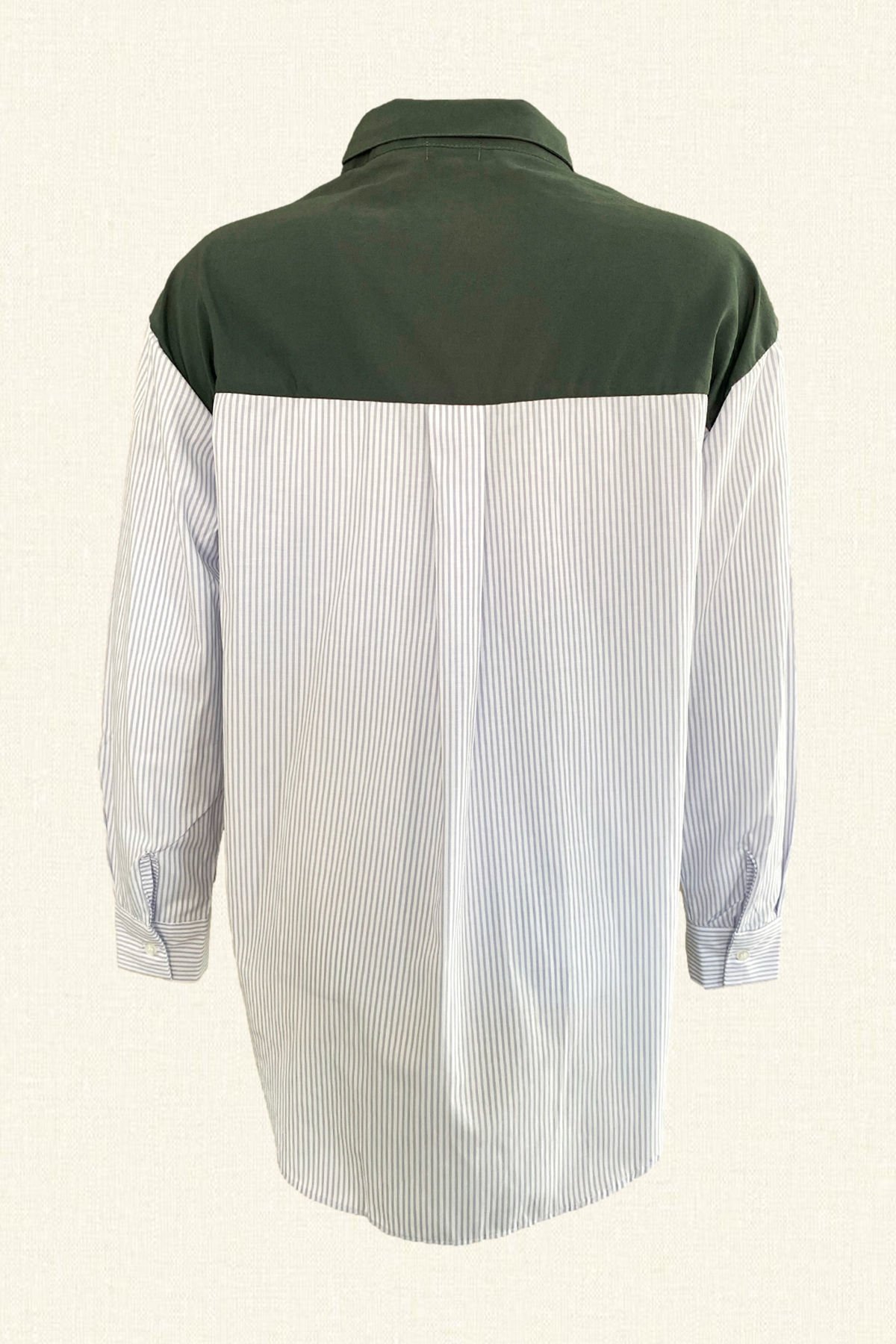 Cep üstünde kristal boncuklardan işlemesi bulunan oversize çizgili gömlek.