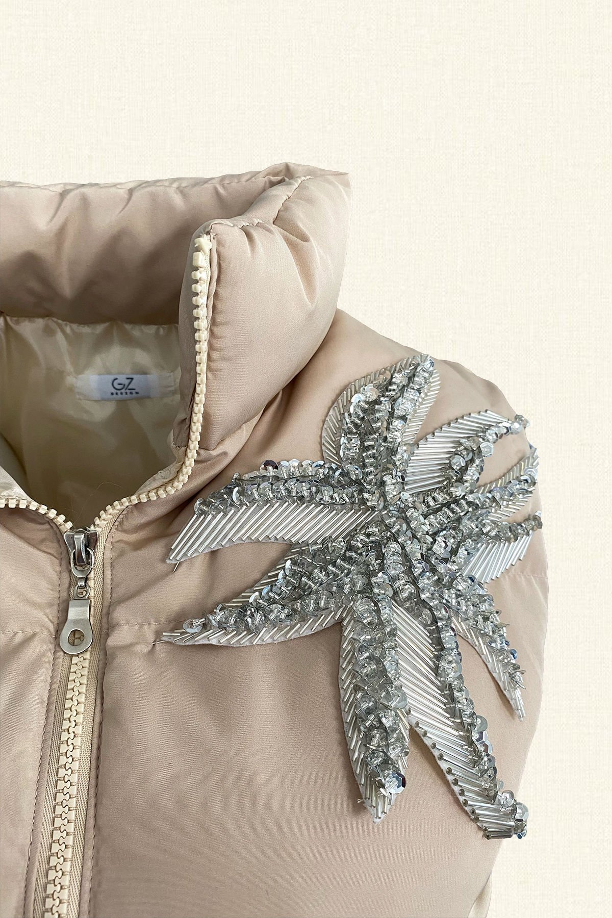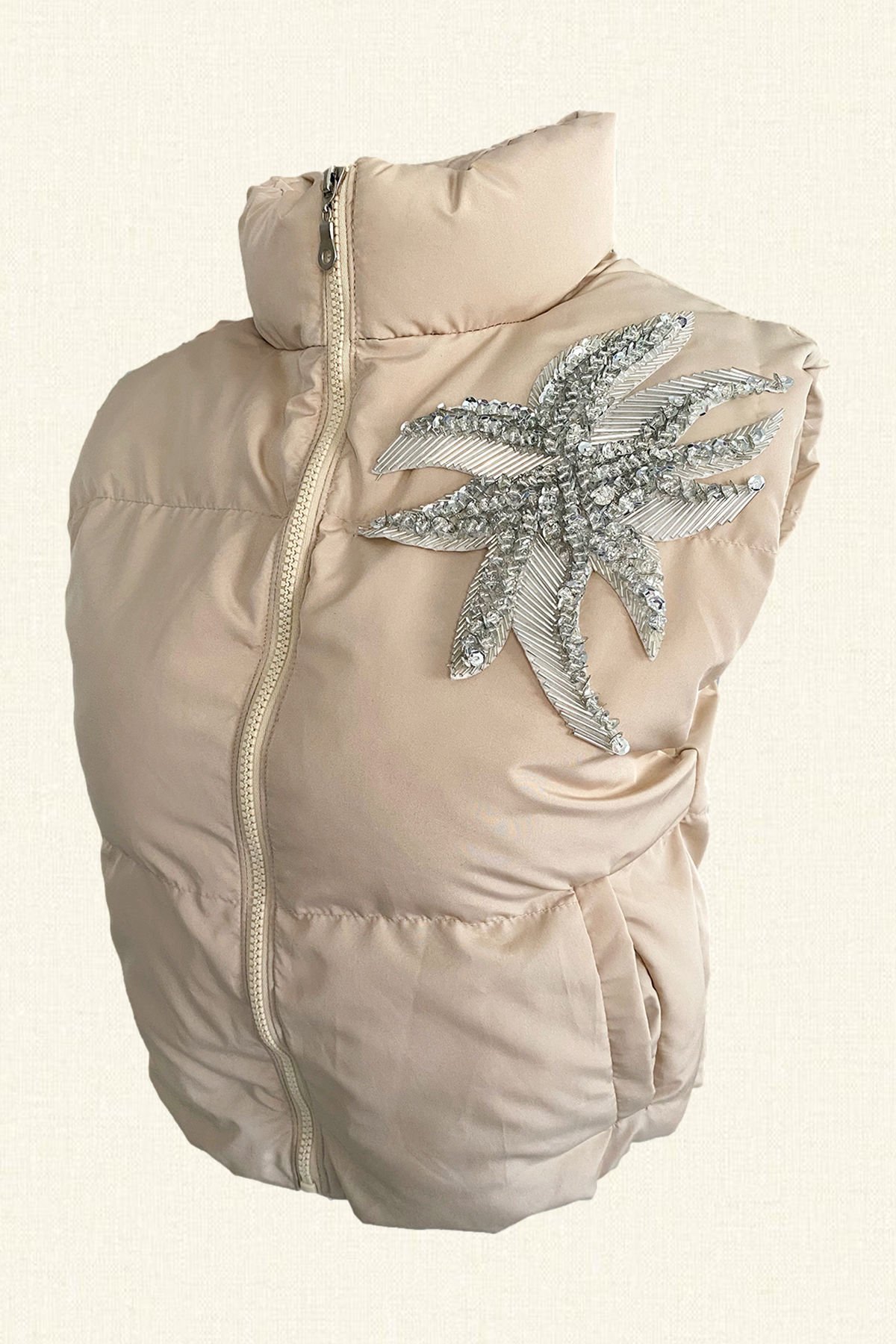 Kristal Boncuk ve taş işlemeli krem rengi şişme yelek.