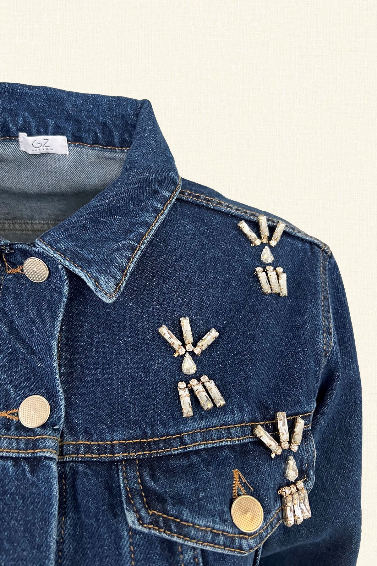 Önünde kristal taştan püskül işlemesi bulunan koyu renk jean ceket.