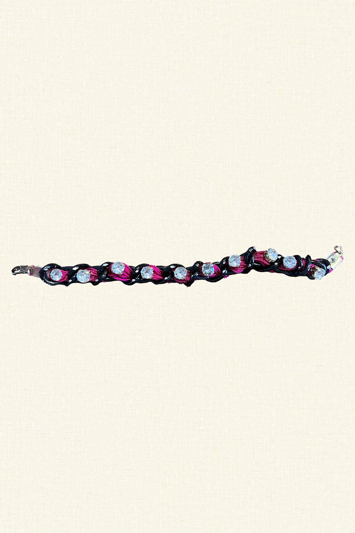 Siyah zincir içinde pembe ipler ve üzerinde kristal detayları olan bileklik.