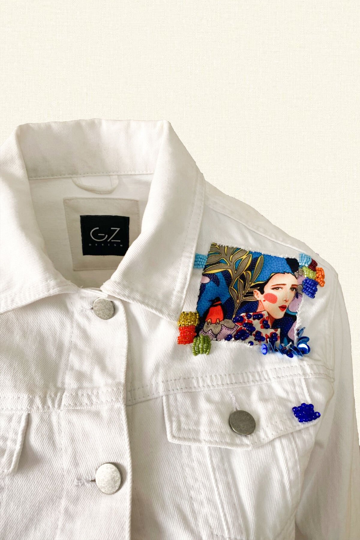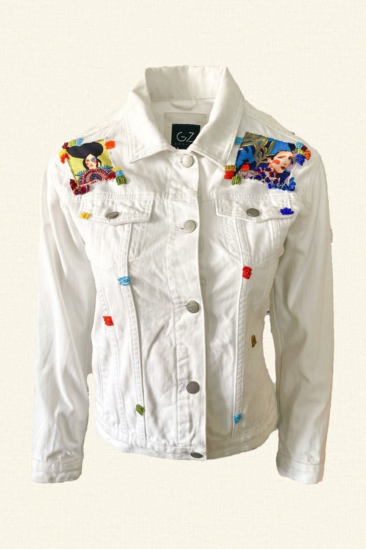 Sırtı kırmızılı kadın figürlü, önü mavili ve yeşilli iki farklı kadın figürlü etrafı rengarenk boncuk işlemeli beyaz renk jean ceket.