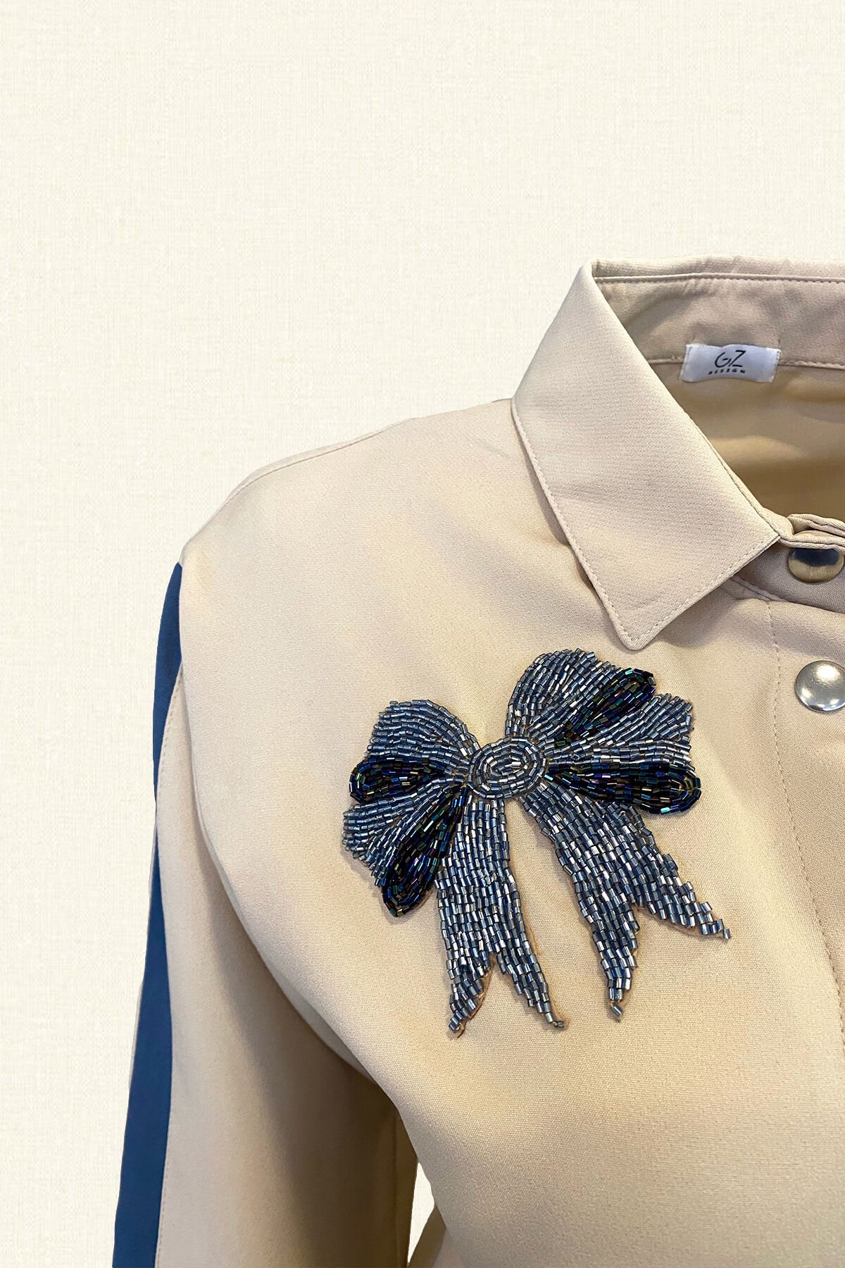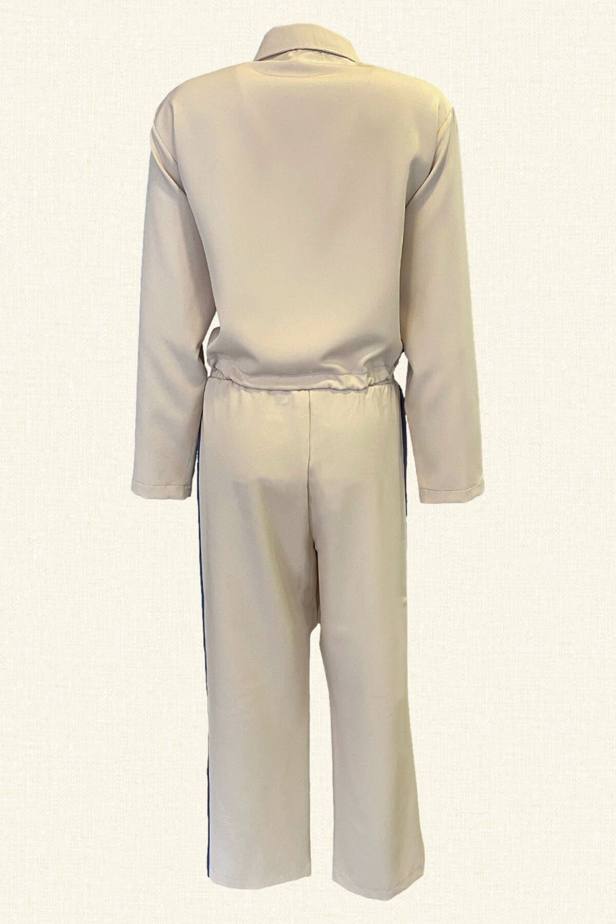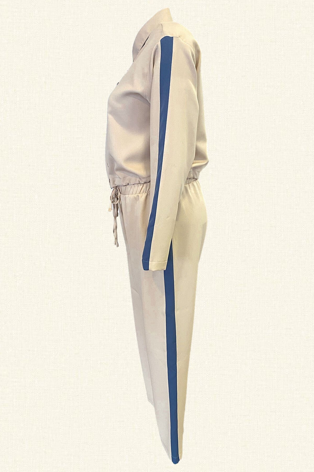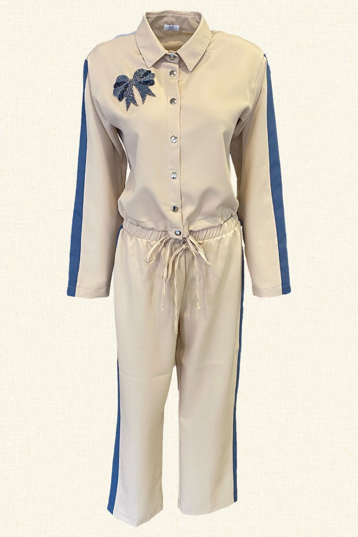 Krem renkli yanlarında mavi şerit, üst kısmı gömlek yaka, bel kısmı bağlama detaylı, yaka kısmında boncuklardan kurdele detaylı alt kısmı ise yüksel bel, geniş paça, bilek boydur.