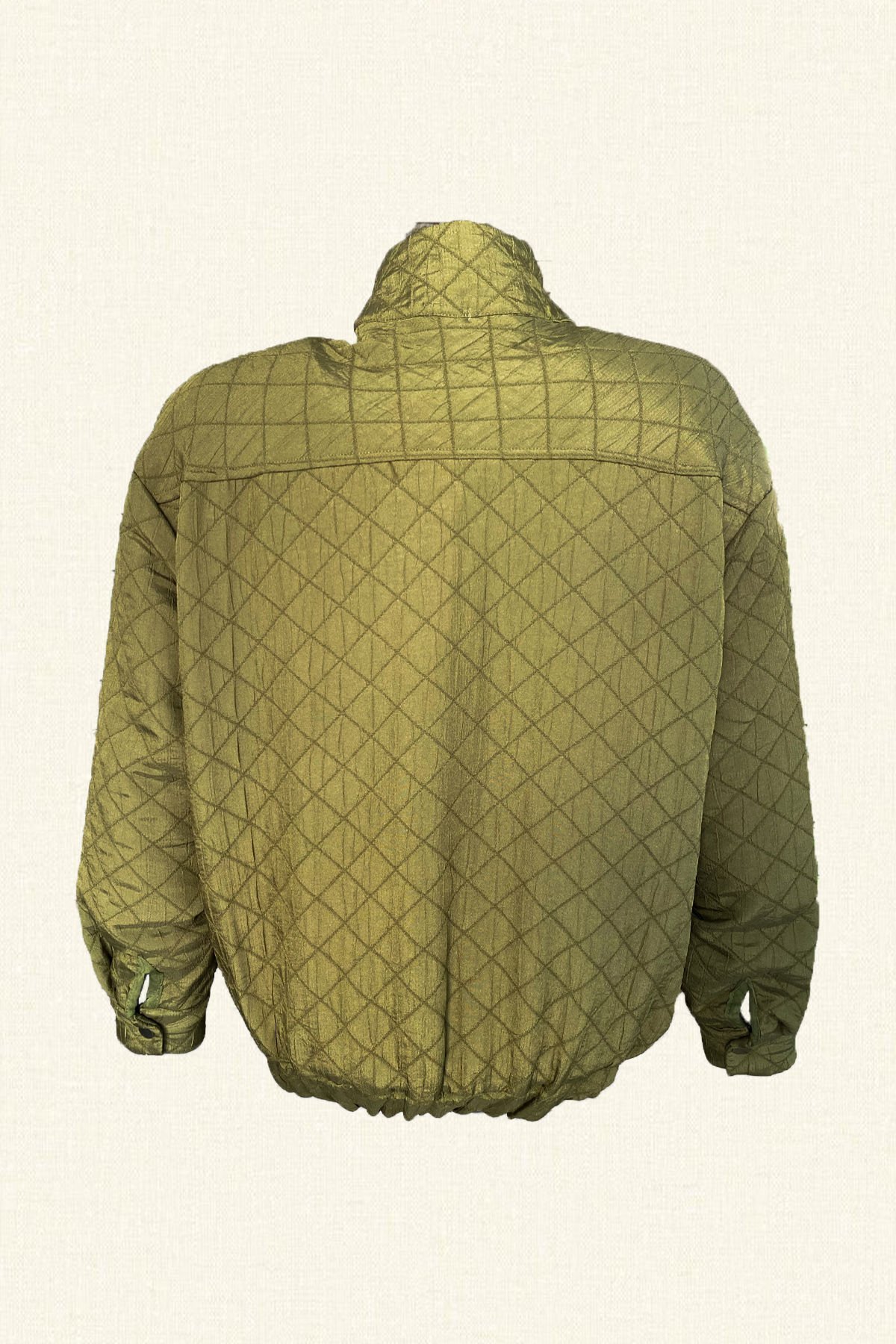 Ön kısmında gold, gümüş pul ve boncuklardan kurdele işlemeli, yeşil renk kapitone bomber ceket.