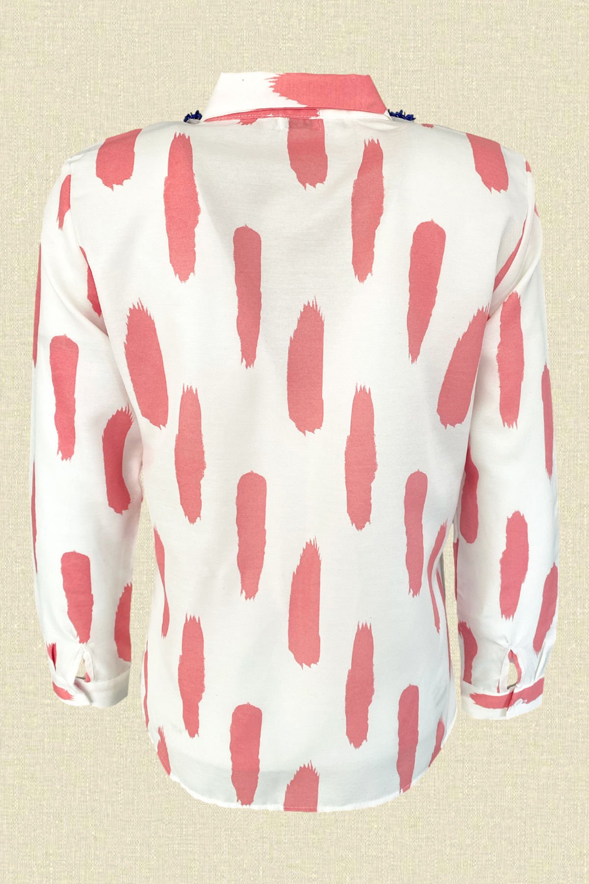 Lacivert İşlemeli Pembe Desenli Beyaz Gömlek