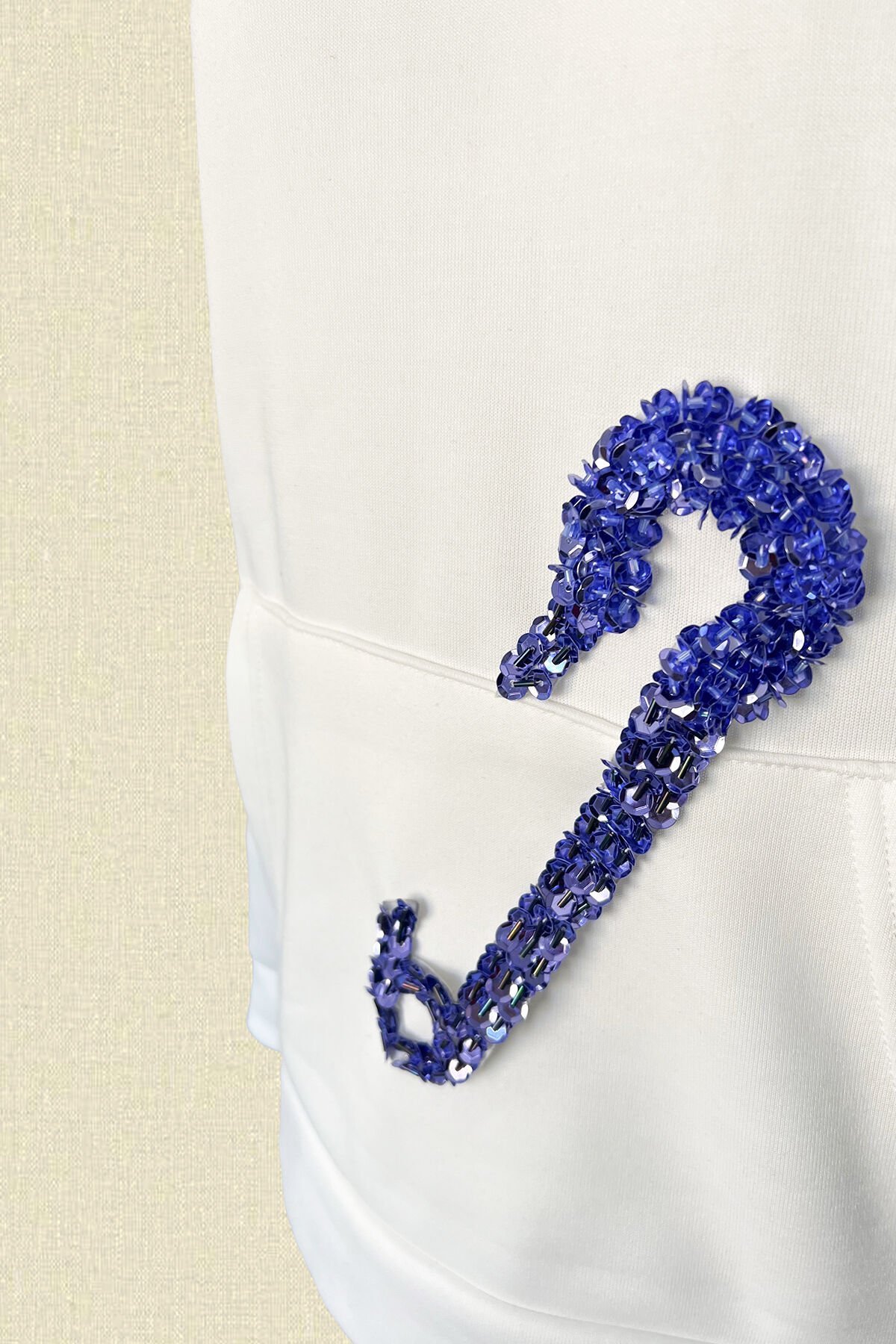 Ön kısmında lila pul ve boncuklardan çengelli iğne işlemesi bulunan, 2 iplik şardonlu, kapüşonlu, kanguru cep detaylı, beyaz renk sweatshirt.