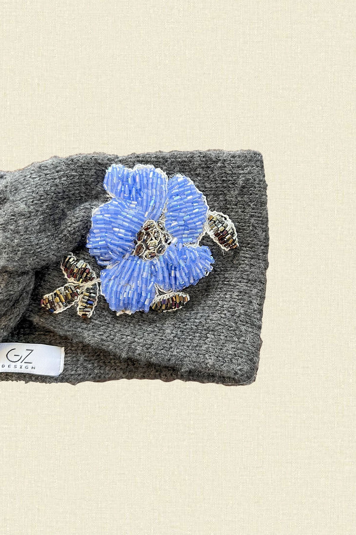 Lila çiçek işlemesi bulunan, gri renk örgü saç bandı.
