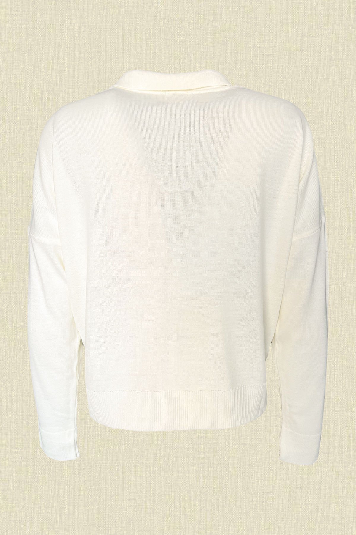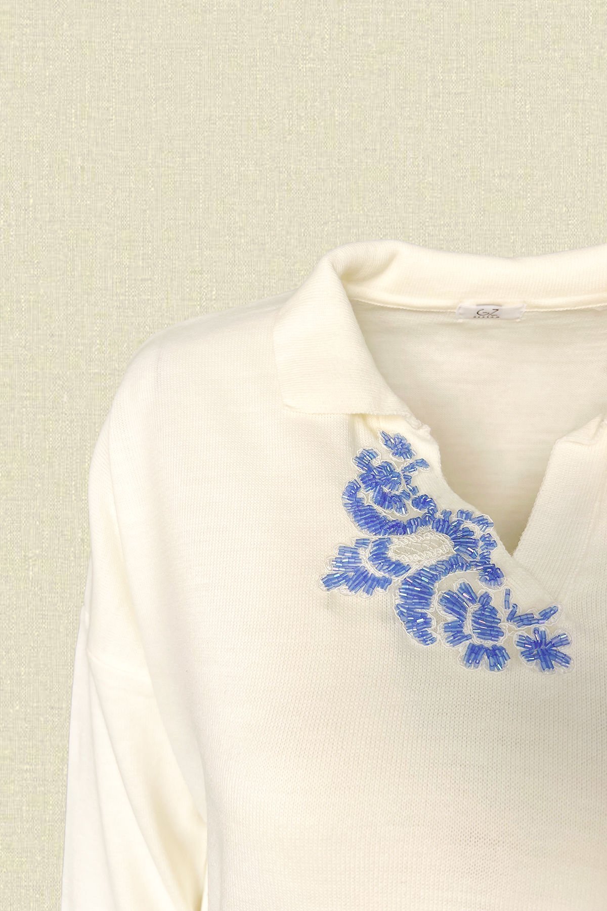 Yaka kısmında lila boncuklardan işlemesi bulunan, kırık beyaz triko kazak.