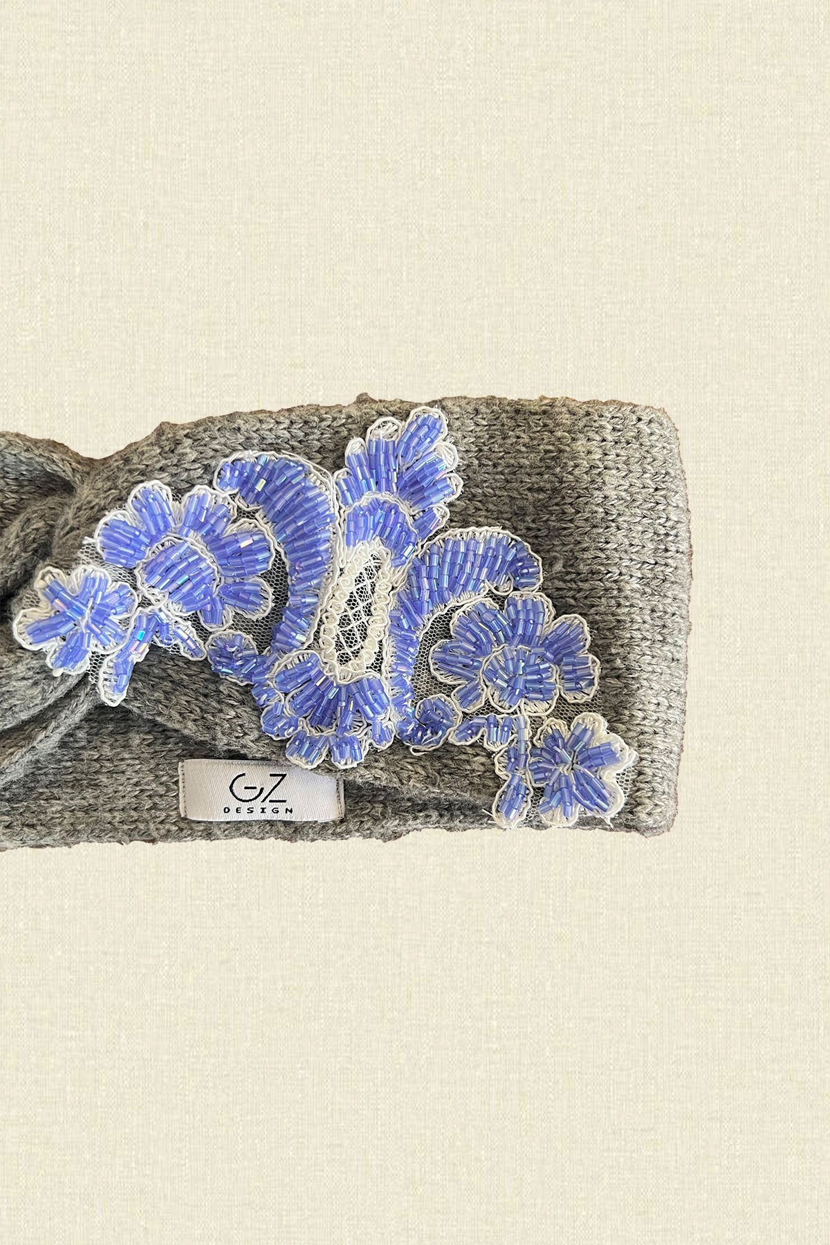 Lila renk işlemesi bulunan, gri renk örgü saç bandı.