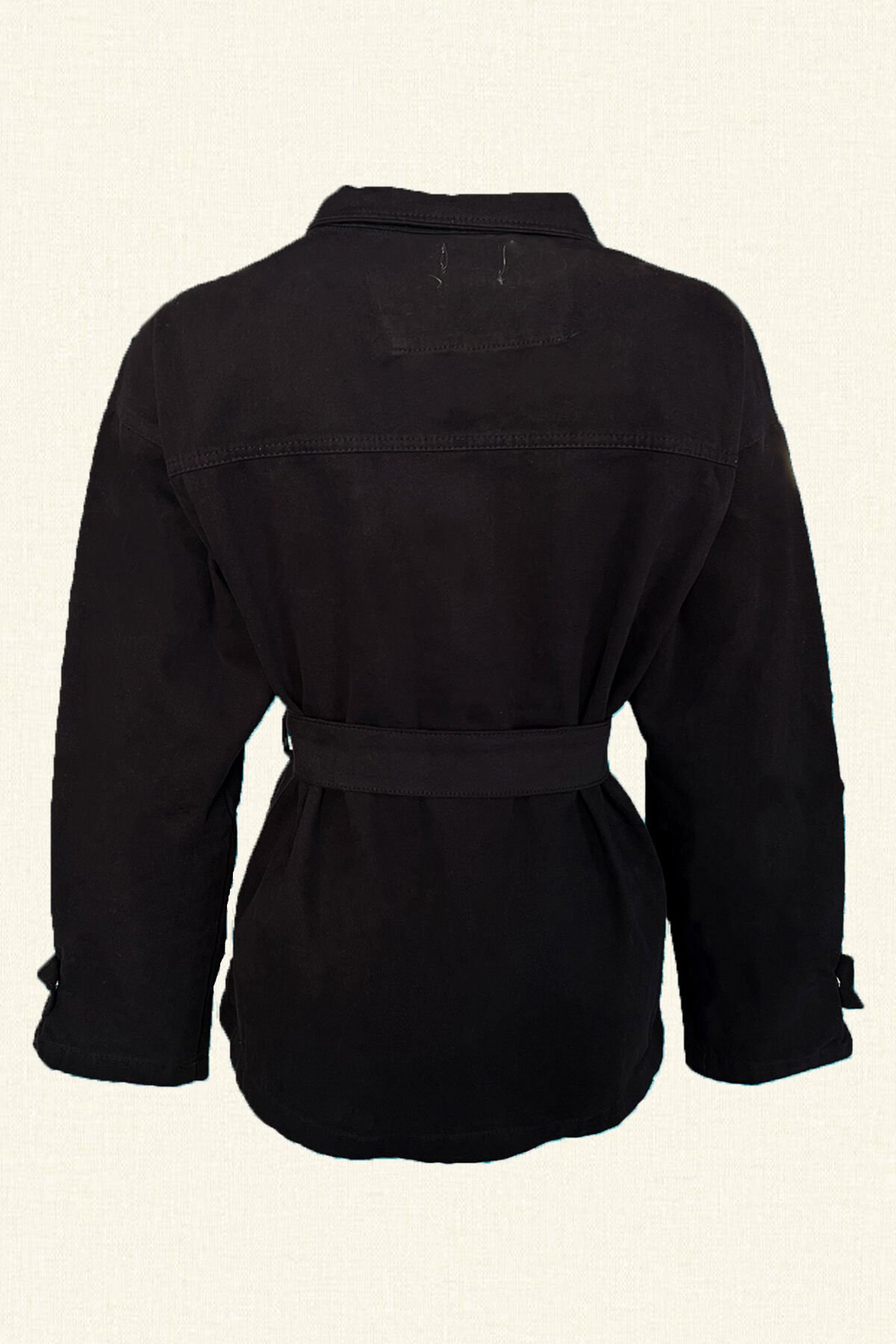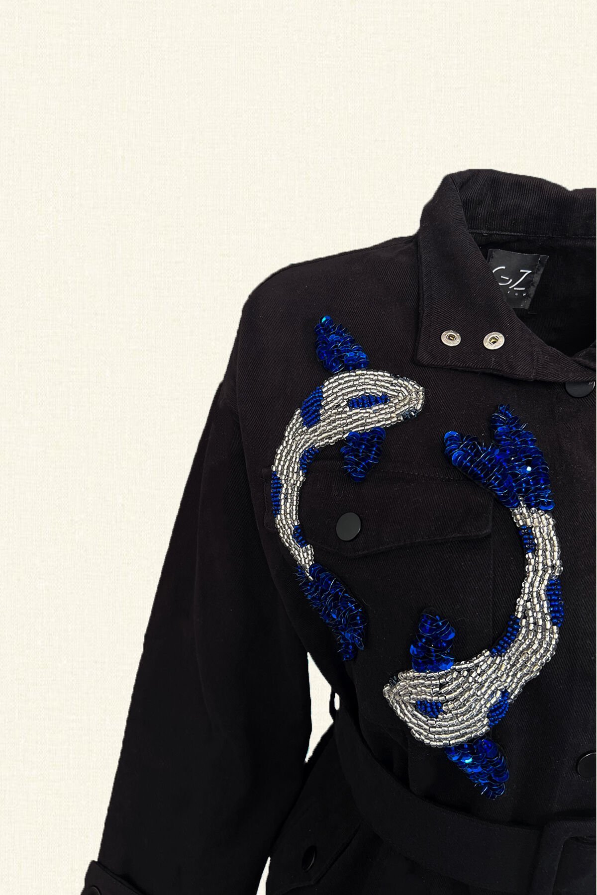 Ön kısmında pul ve boncuklardan iki tane balık işlemeli, siyah renk, kemer detaylı jean ceket.