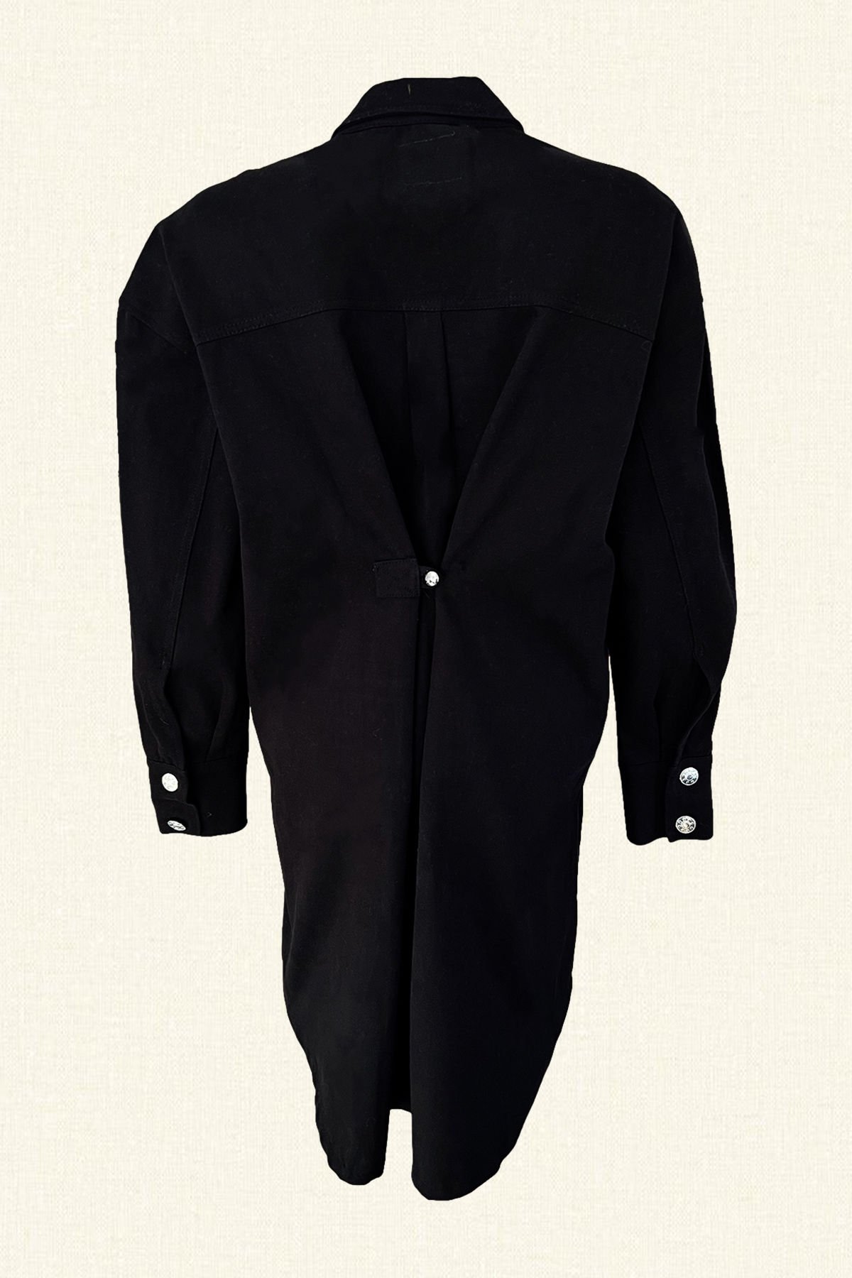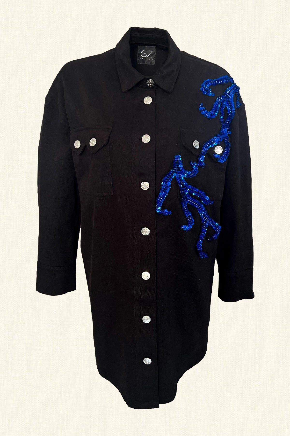 Omuz kısmından aşağıya doğru inen pul ve boncuklardan dal motifli, arka kısmında düğme detayı bulunan siyah jean ceket.