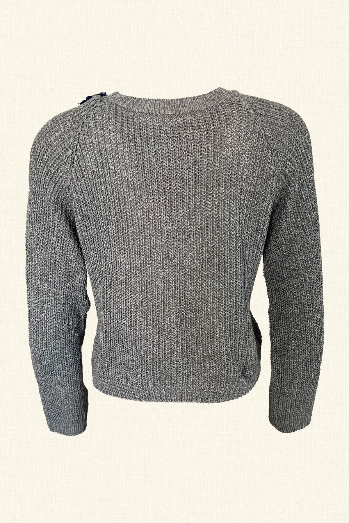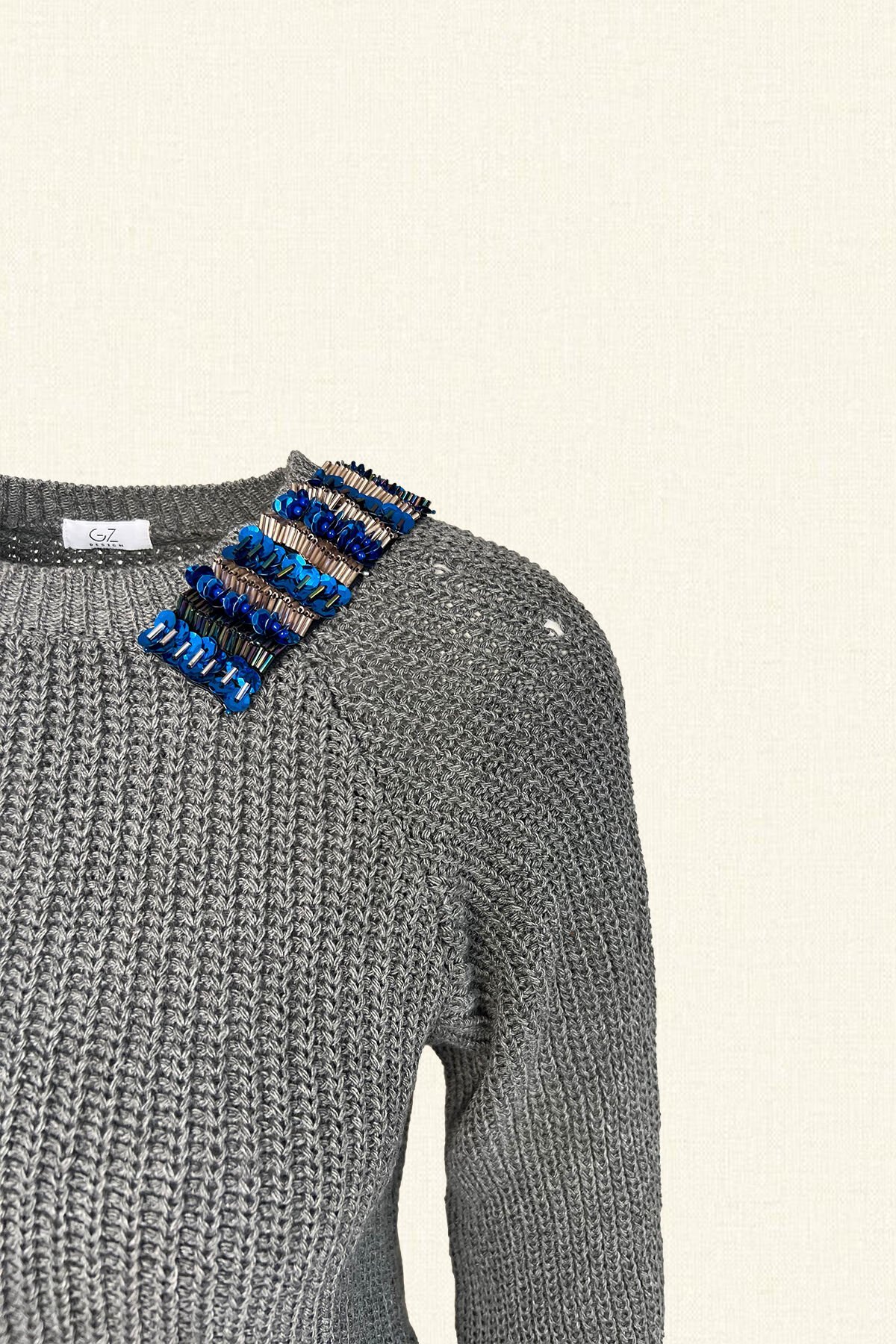 Omuz kısmında mavi ve gri pul, boncuk işlemesi bulunan, kollarında yuvarlak delik detaylı, gri örme triko kazak.