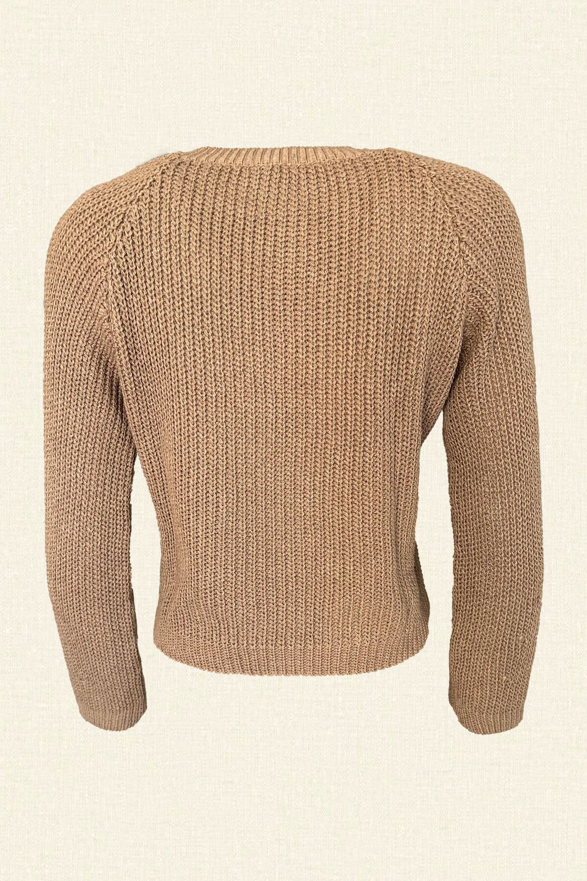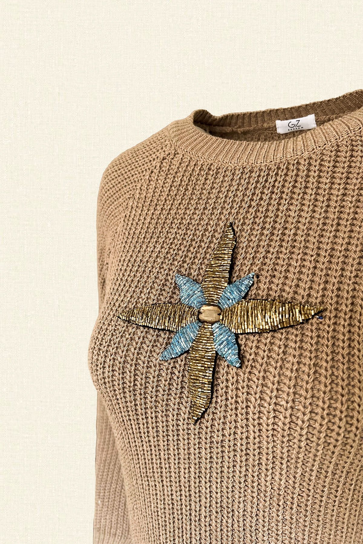 Ön kısmında gold ve mavi boncuklardan işlemesi bulunan, kollarında yuvarlak delik detaylı, krem örme triko kazak.