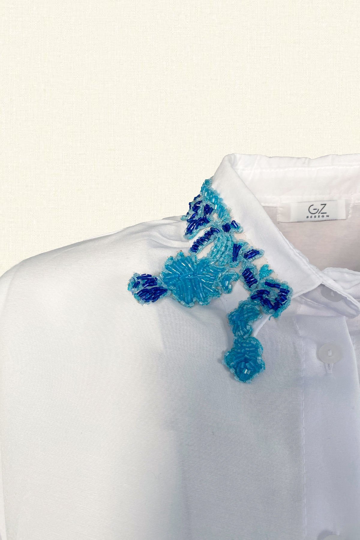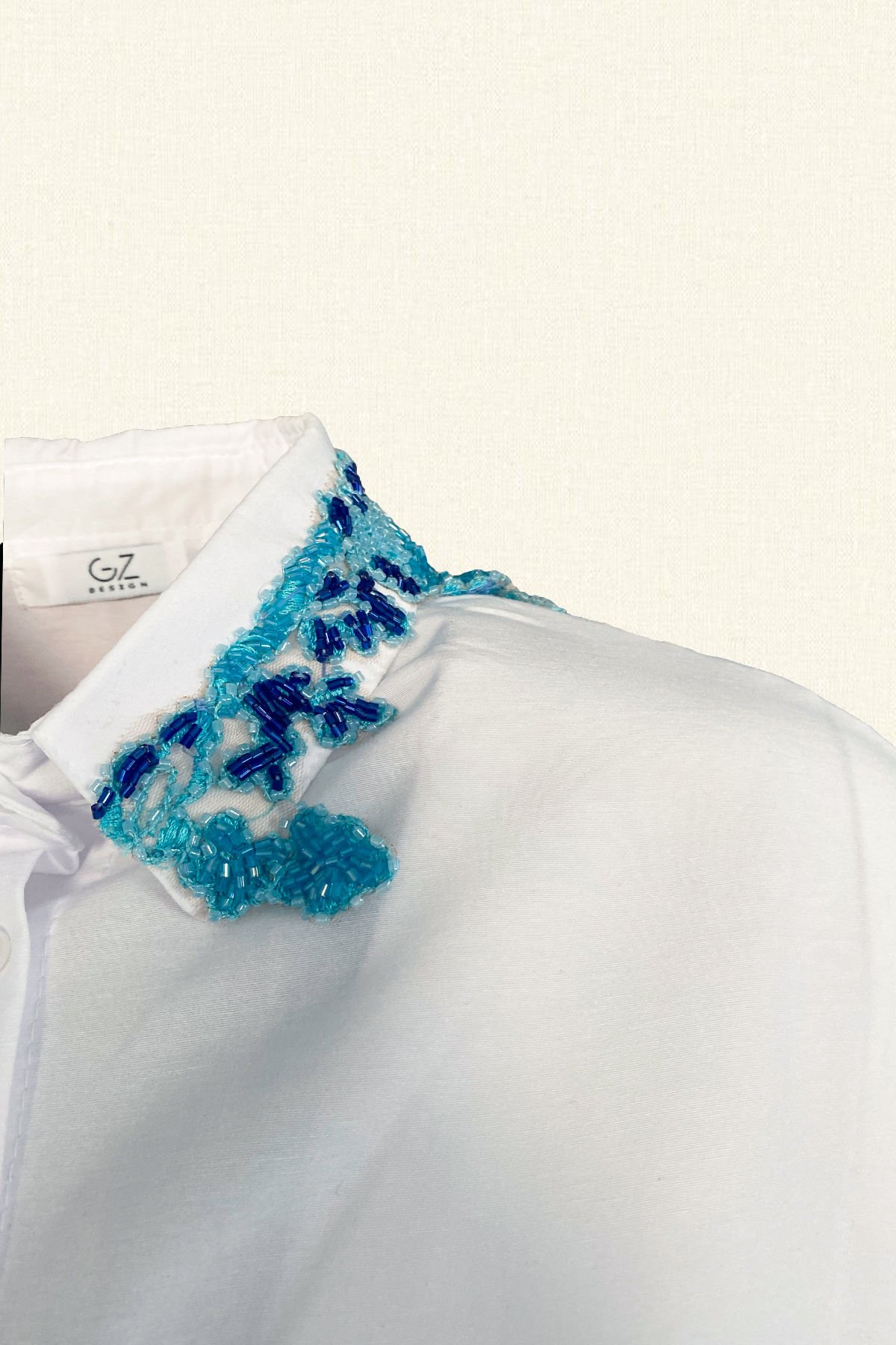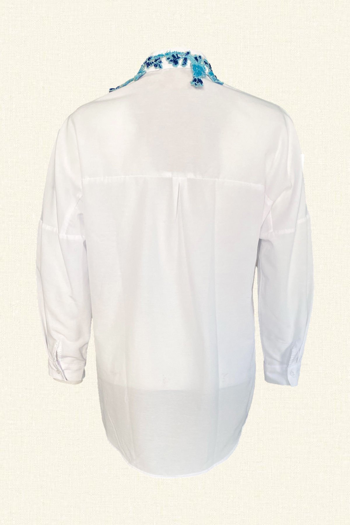 Gömleğin yakasında mavi ve lacivert boncuklardan çiçek işlemeli oversize beyaz gömlek.