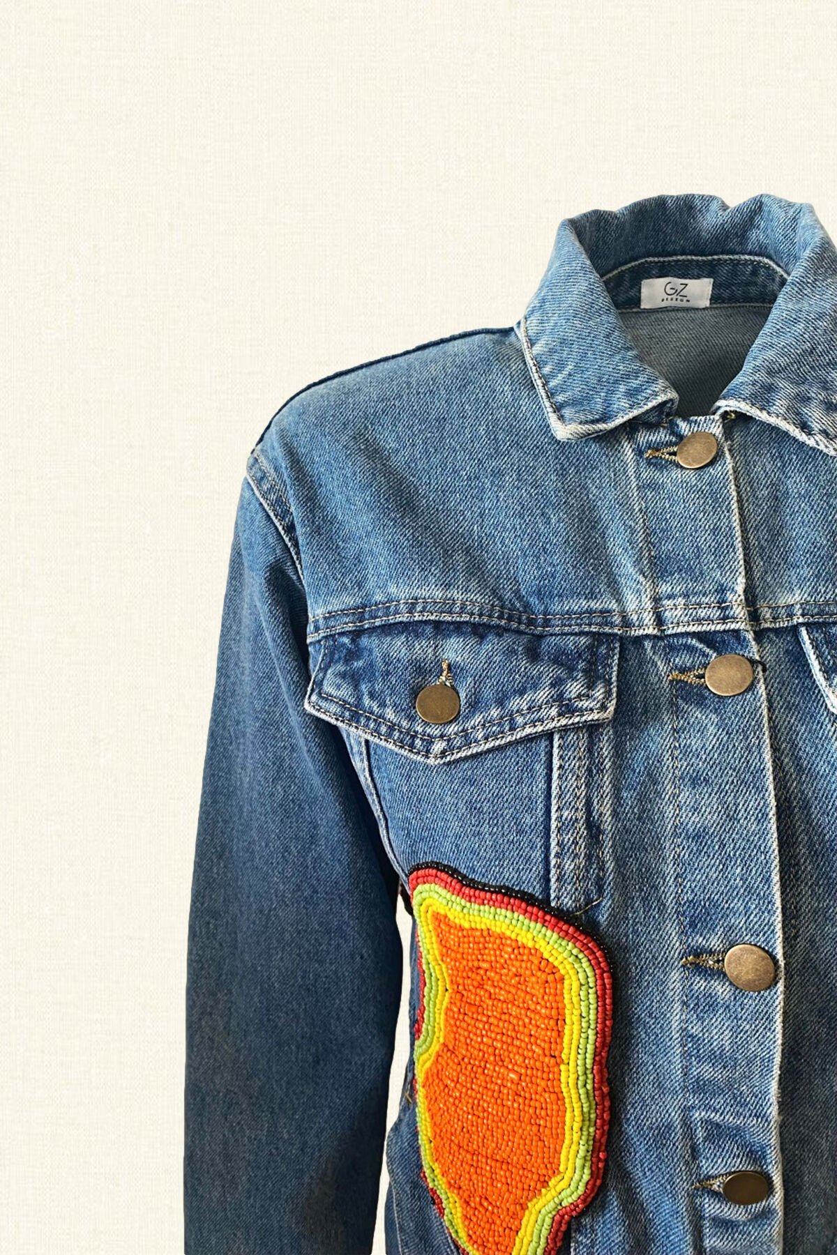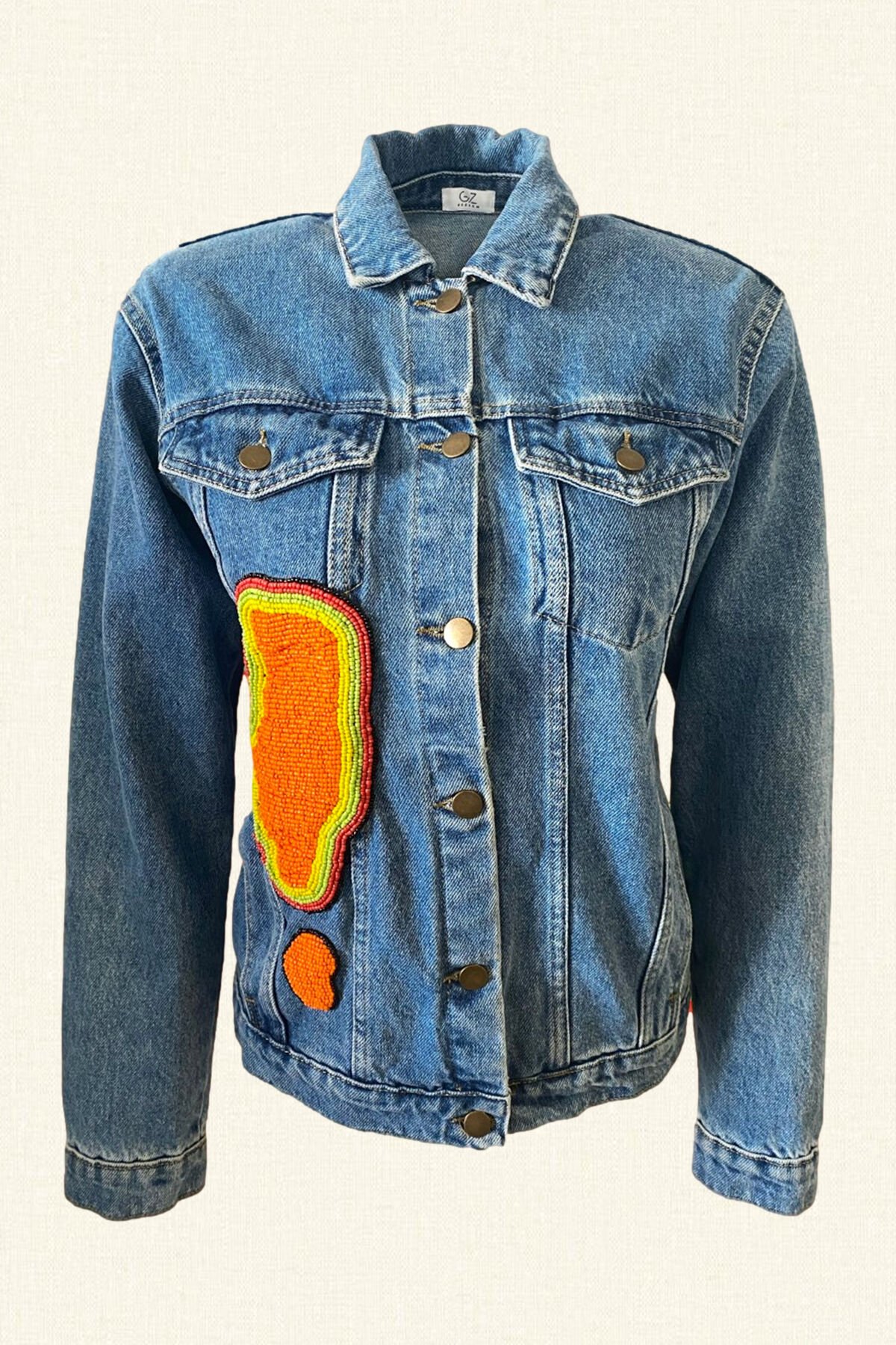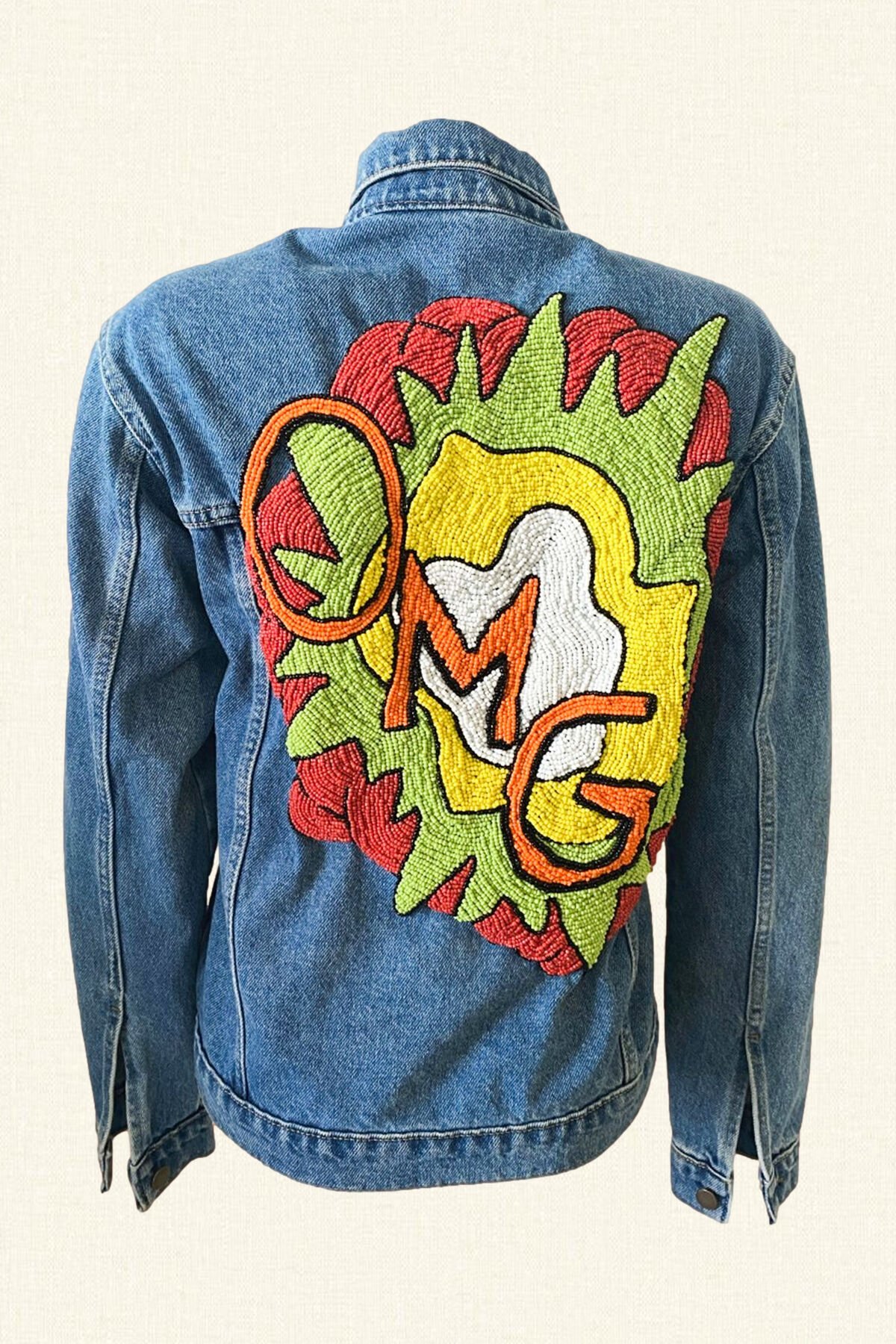 Sırtı renkli OMG figürlü boncuk işlemeli, önü renkli ünlem motifli, açık renk jean ceket.