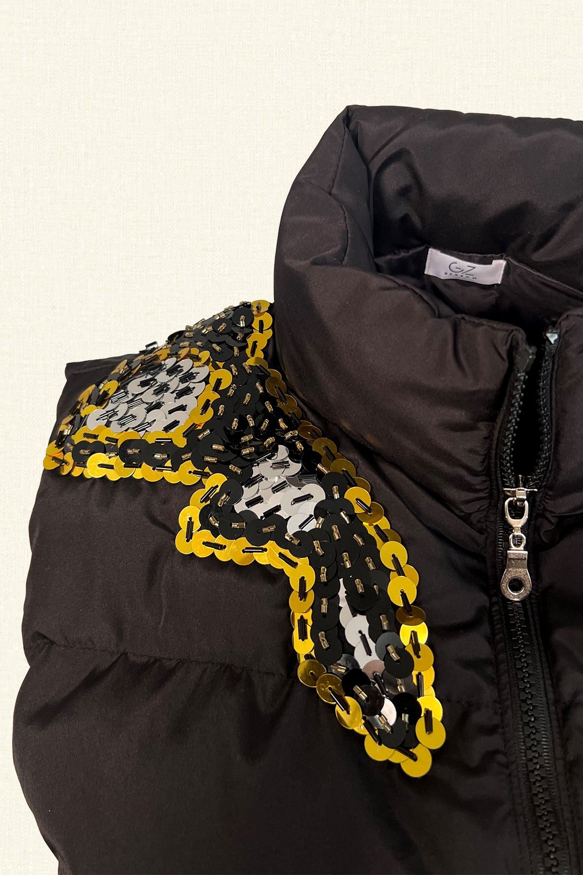 Omuzdan sırta siyah ve gold renk pul işlemeli siyah bomber, şişme yelek.