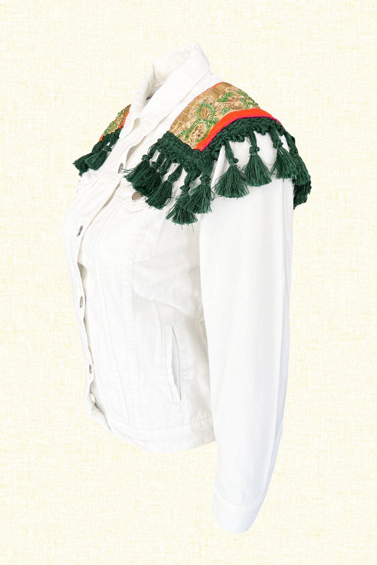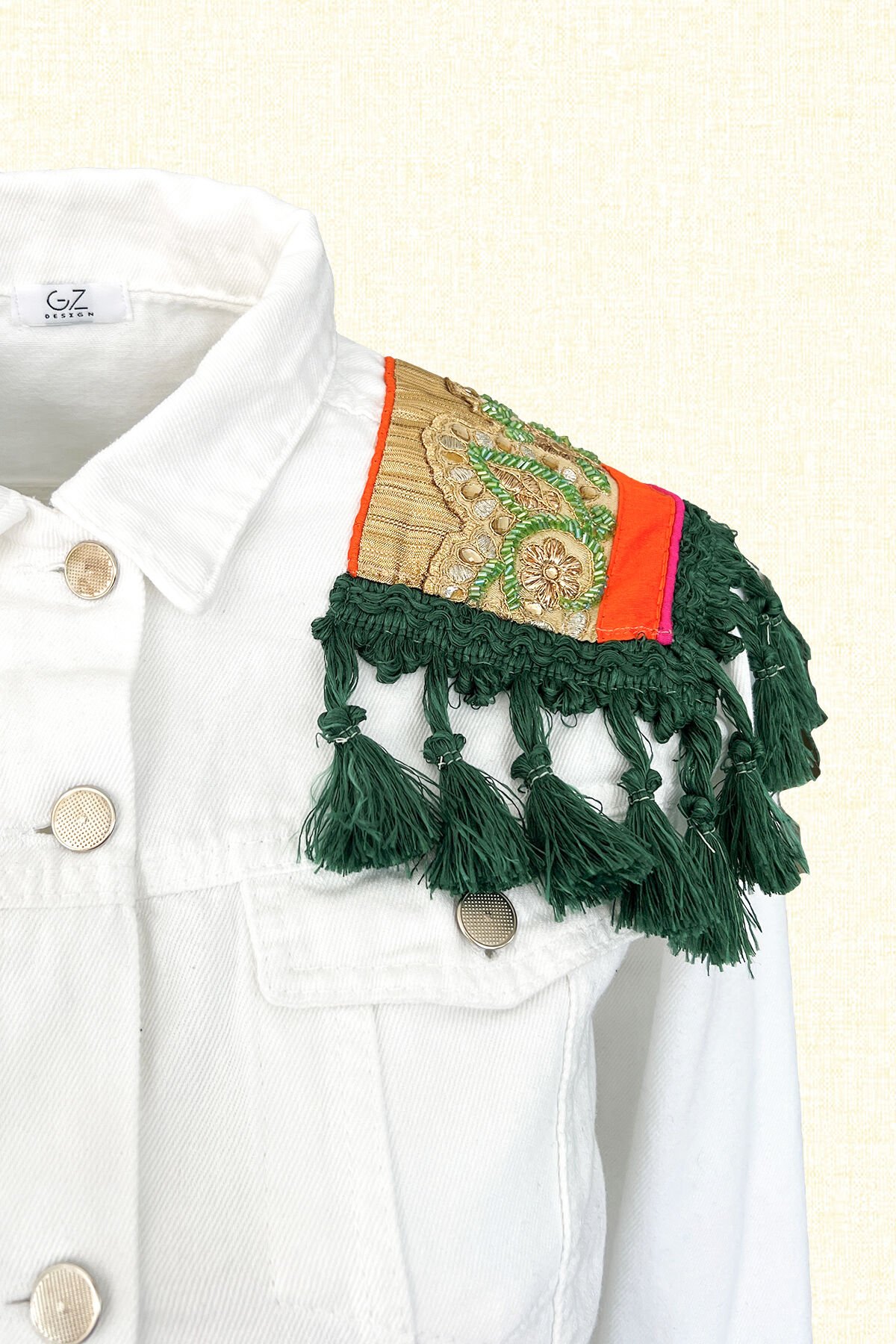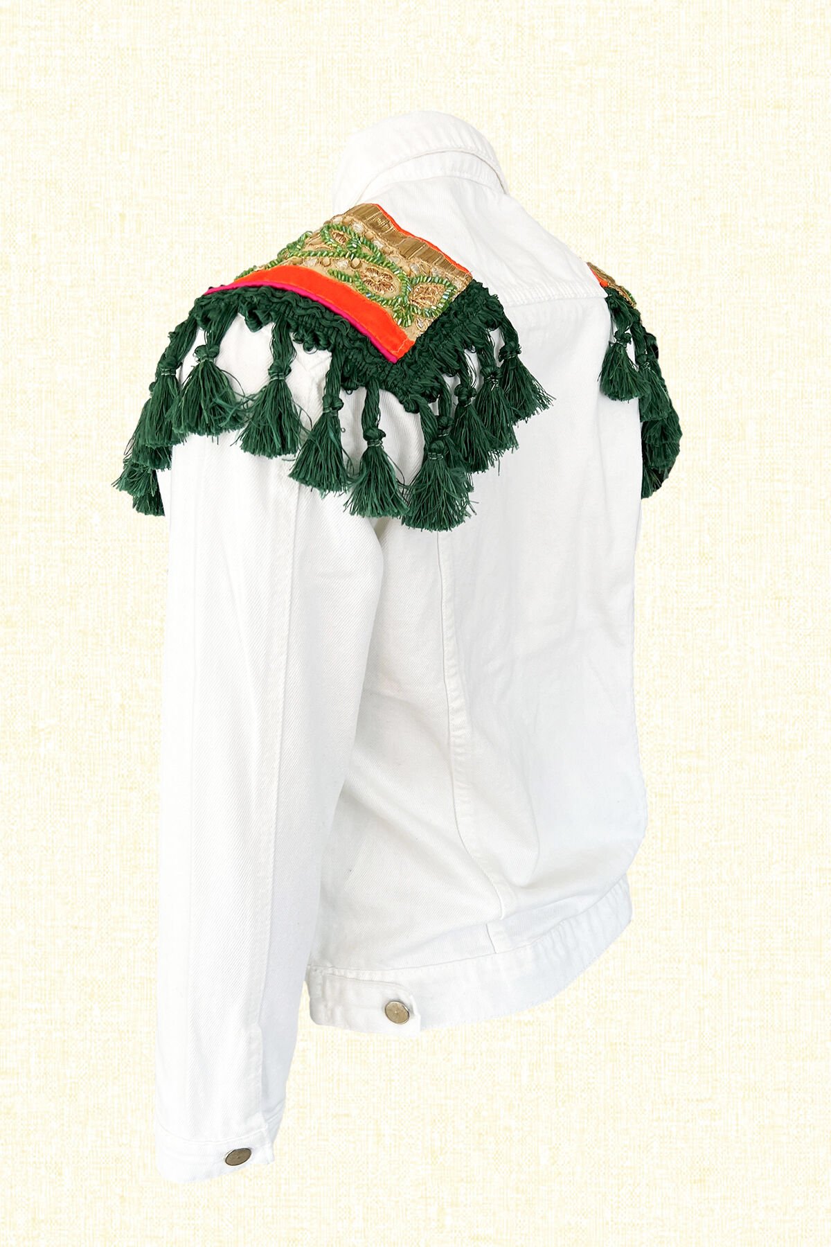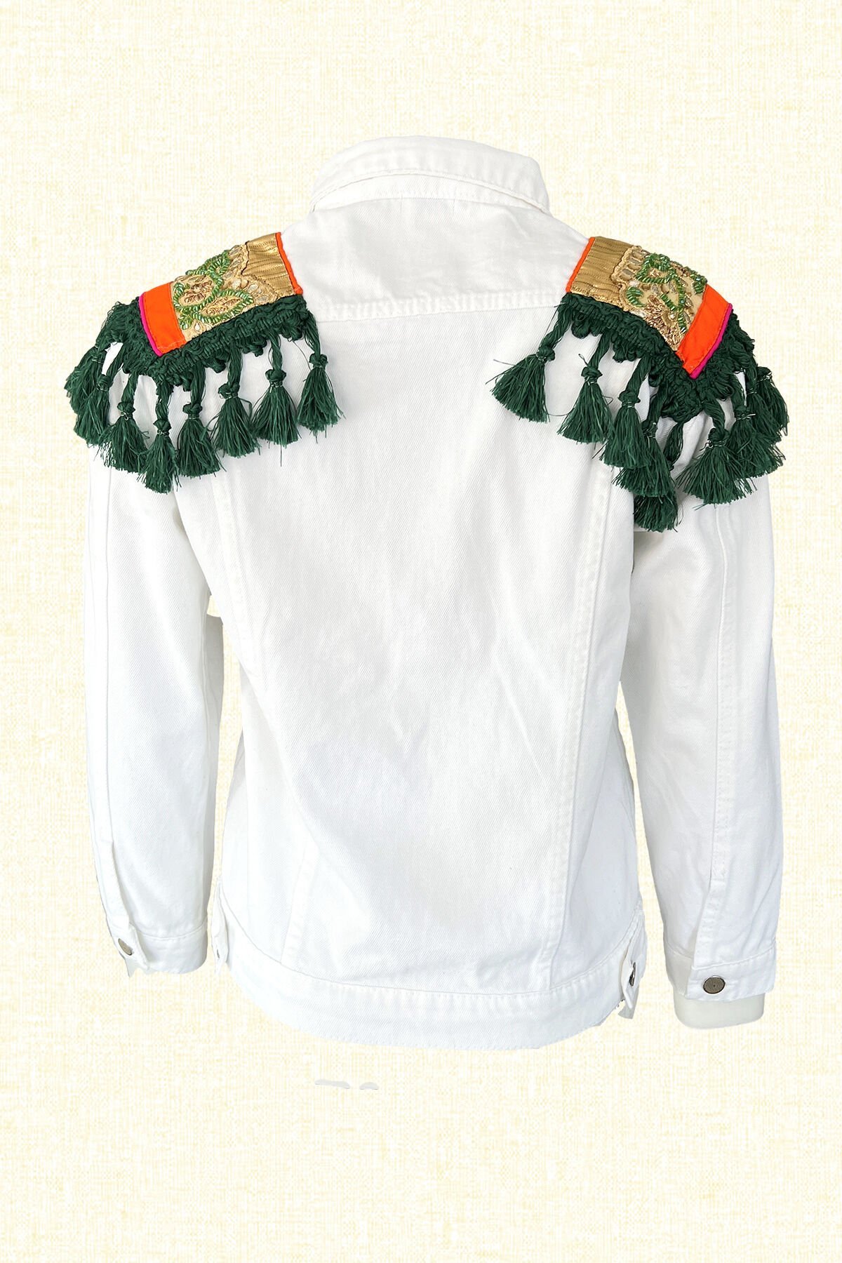 Omuzlarında turunculu ve gold Hint motifi üzerine yeşil boncuk işlemeli ve püskül detaylı beyaz jean ceket.
