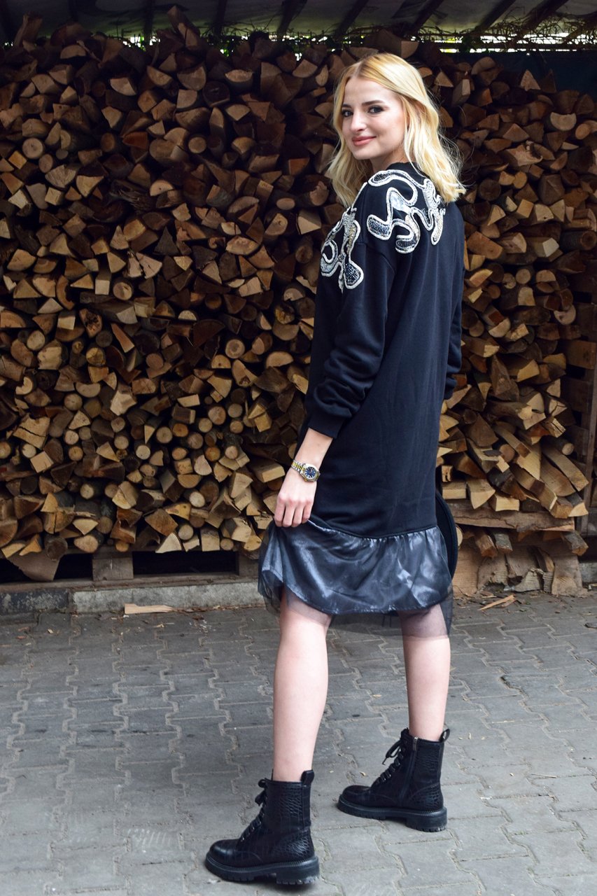 Omuzdan sırta boncuk işlemeli etek ucu tül detaylı elbise.