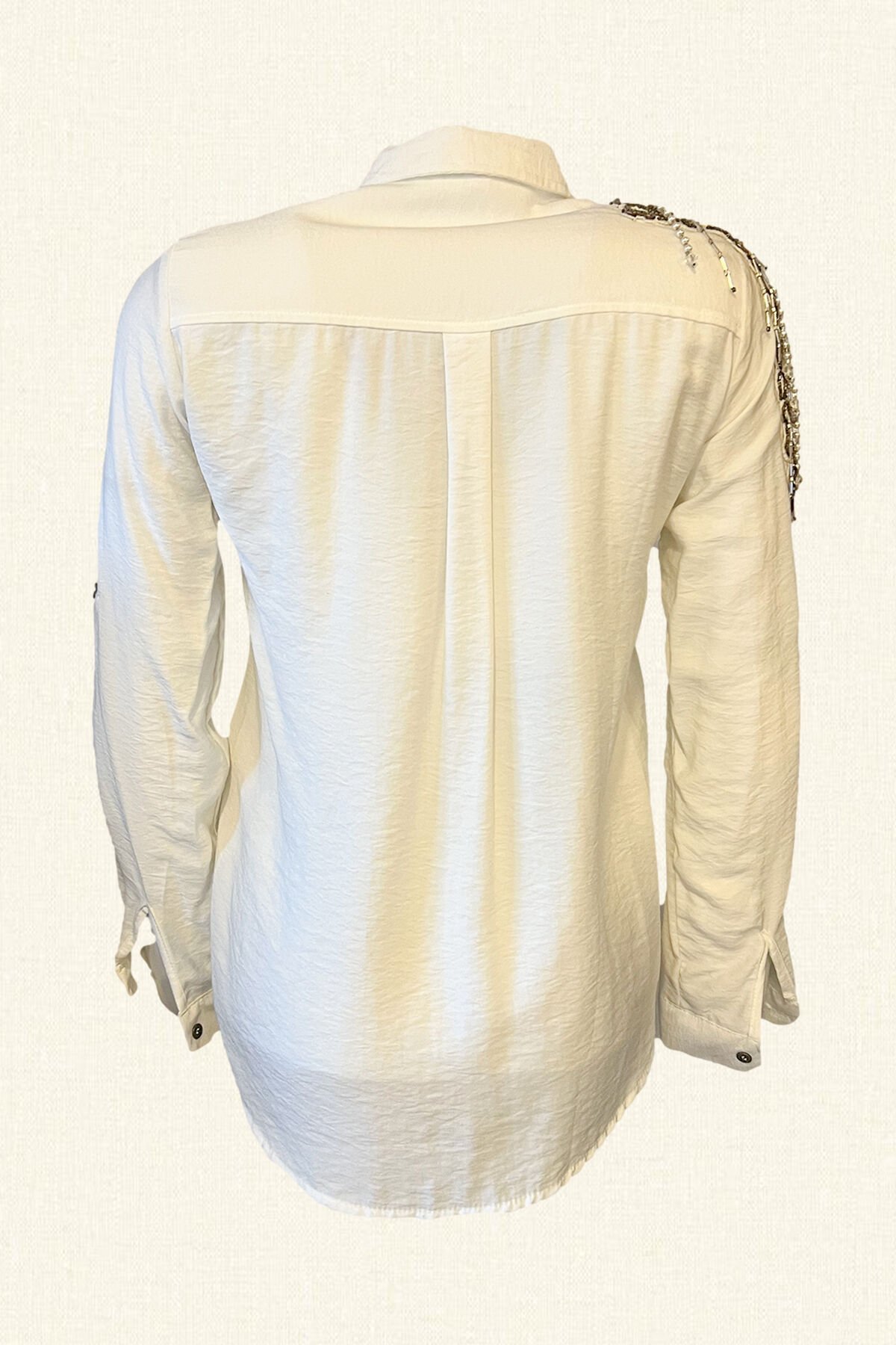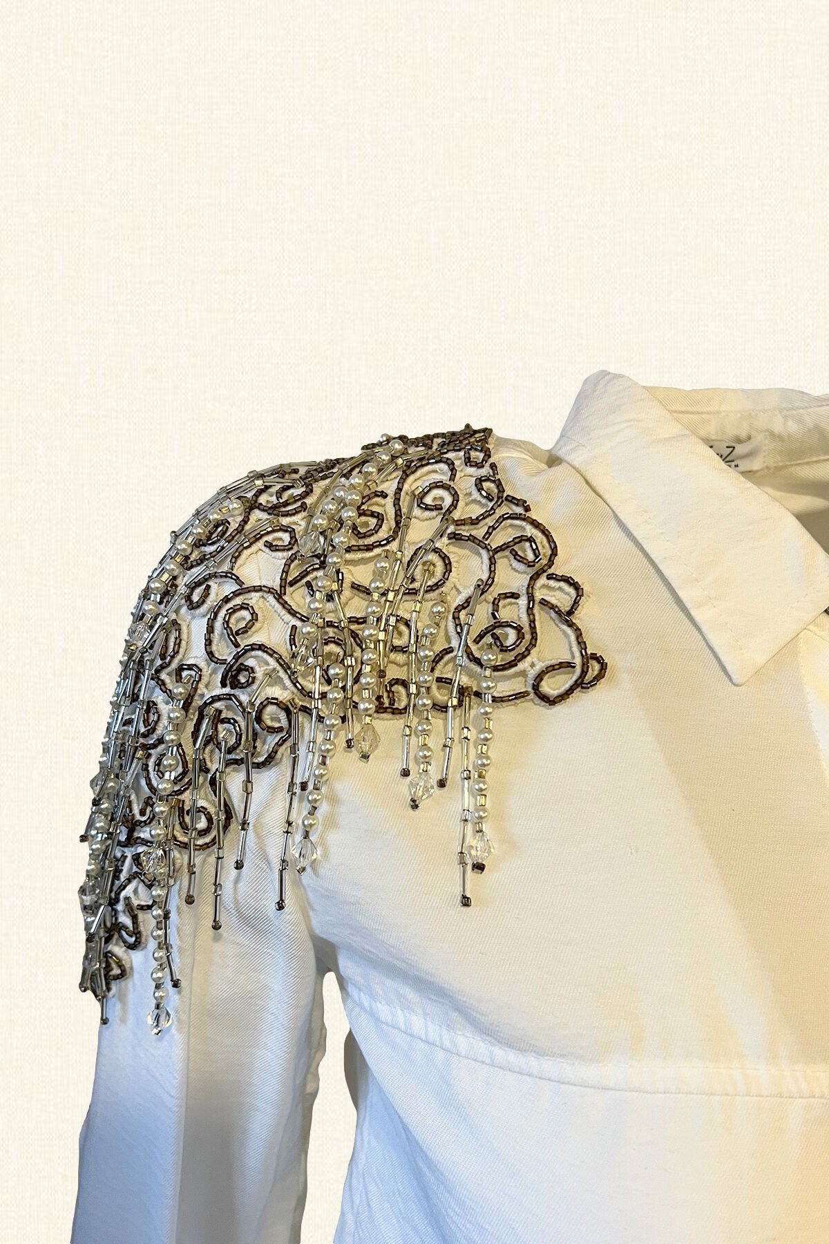 Omuzdan kola püskül kristal boncuk ve inci detaylı beyaz gömlek.