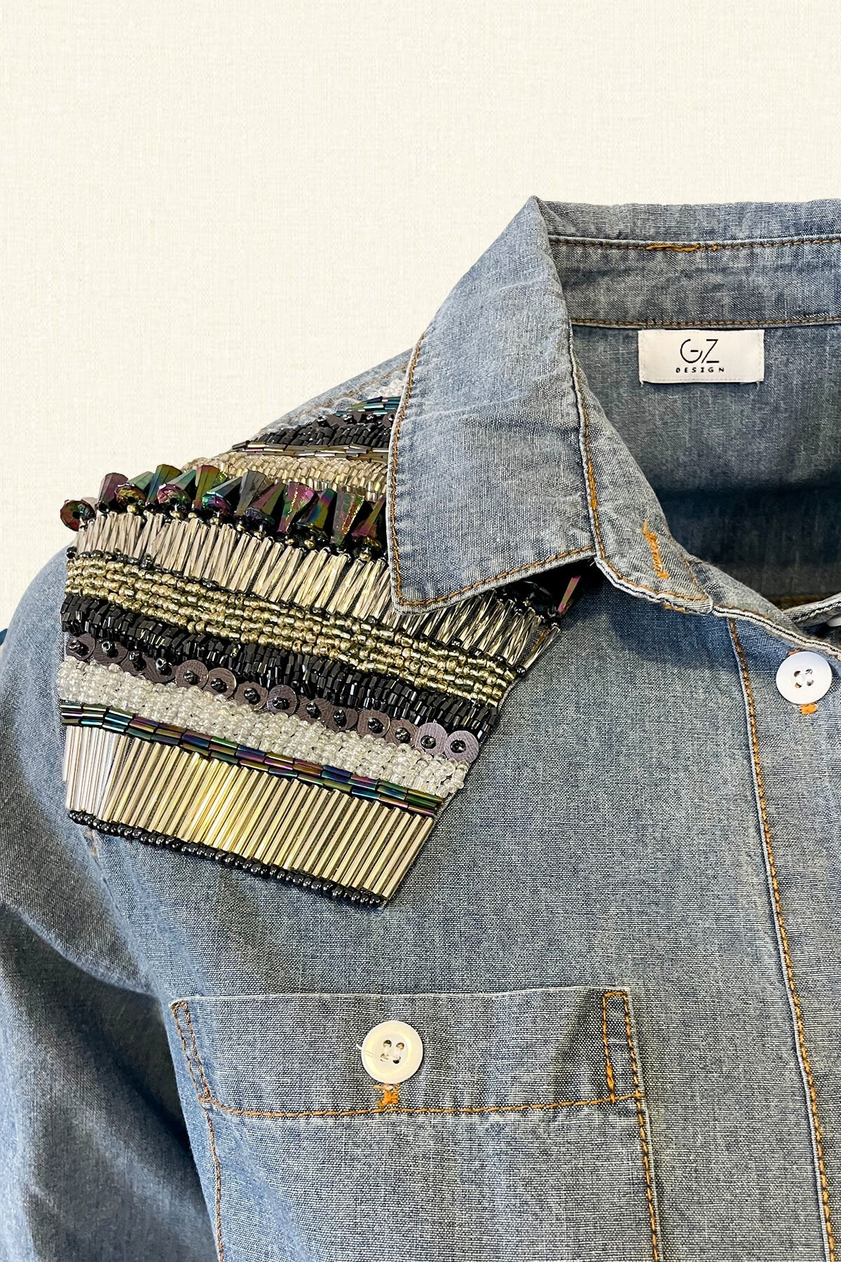 Ön robası kristal taş ve boncuk işlemeli açık renk kısa denim gömlek.