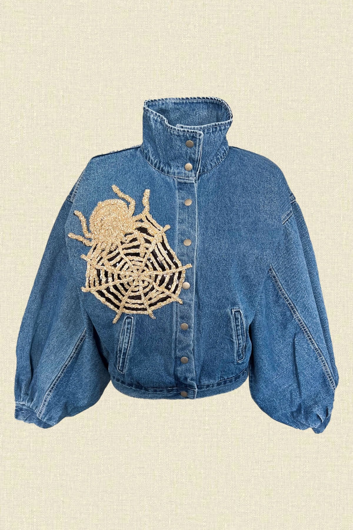 Örümcek İşlemeli Balon Kollu Jean Ceket
