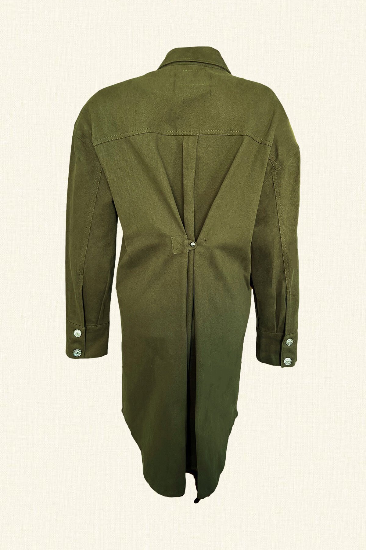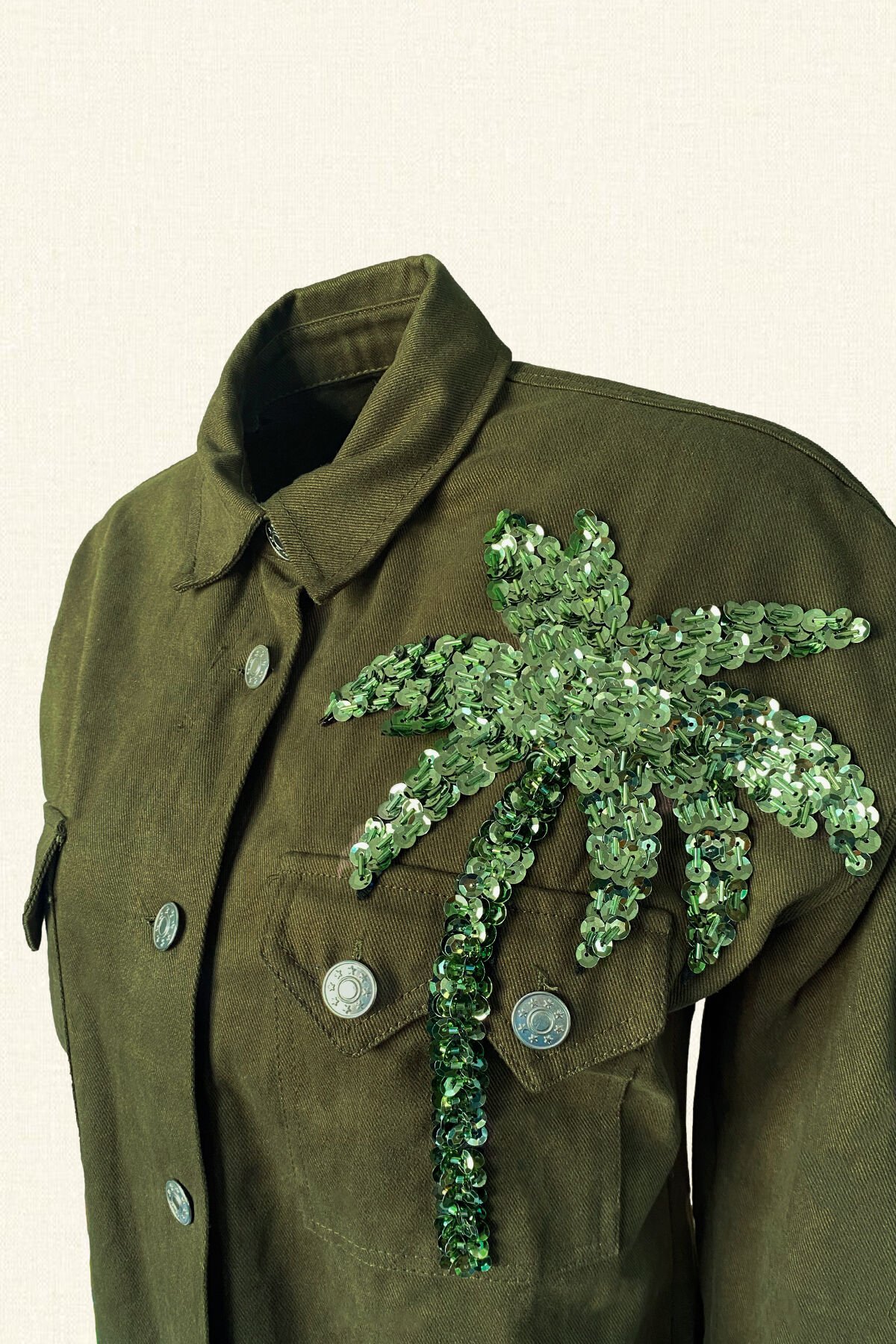 Ön kısmında pul ve boncuklardan işlenmiş palmiye bulunan, arka kısmında düğme detayı bulunan uzun yeşil jean ceket.