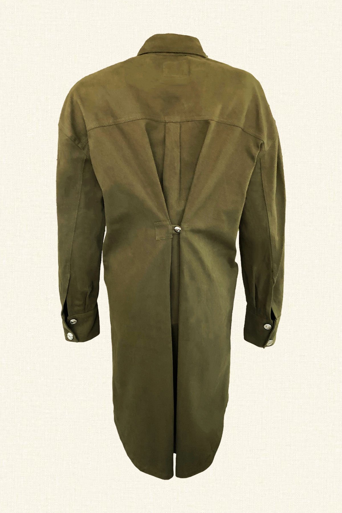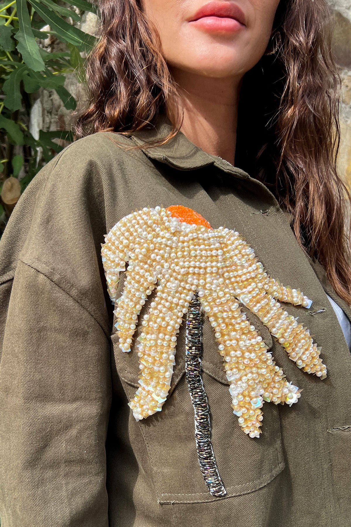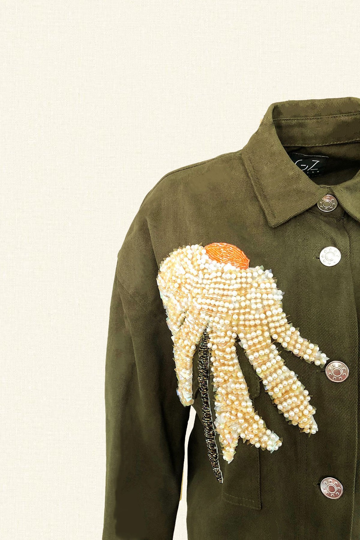Ön kısmında pul,boncuk ve incilerden işlenmiş papatya bulunan, arka kısmında düğme detayı bulunan uzun yeşil jean ceket.