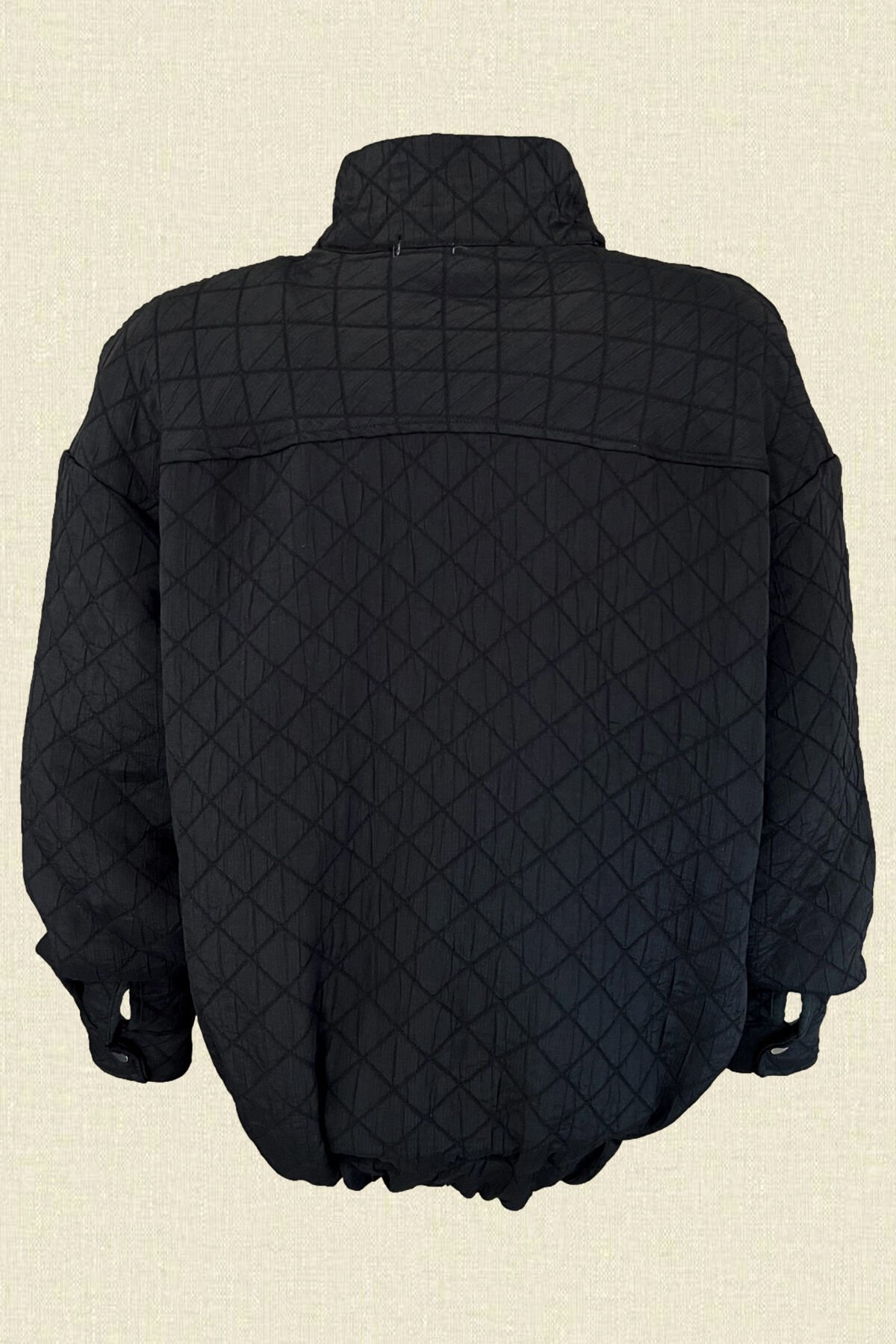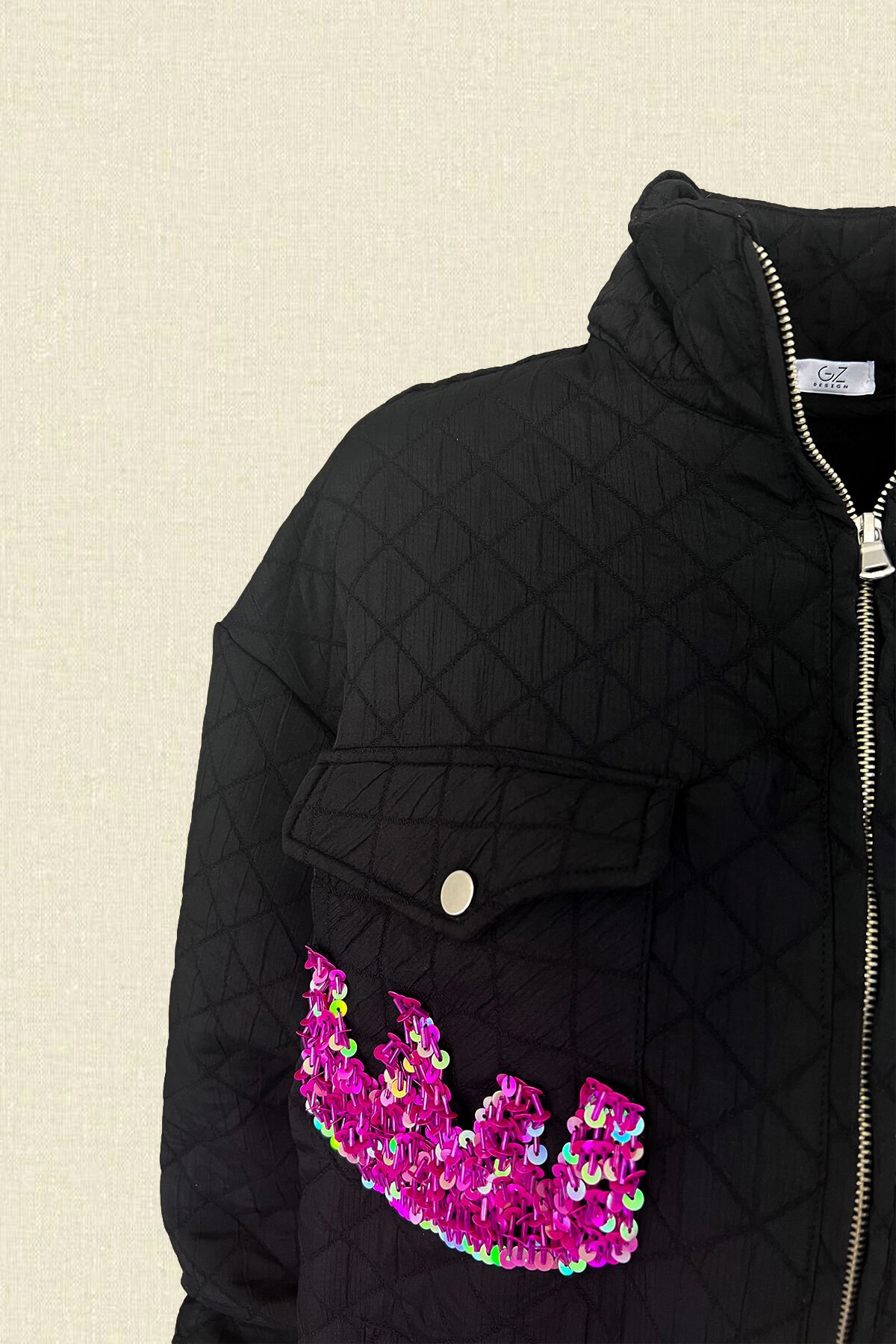 Cep kısmında pembe pul ve boncuklardan alev işlemeli, siyah renk kapitone bomber ceket.