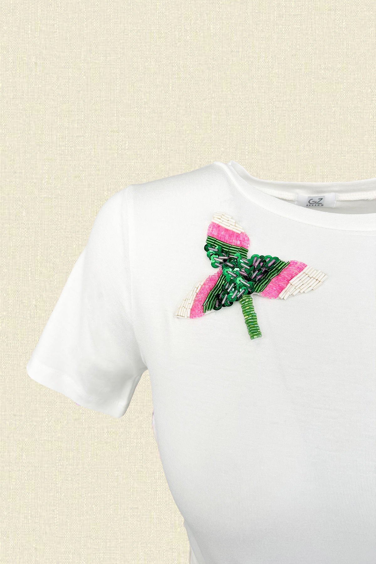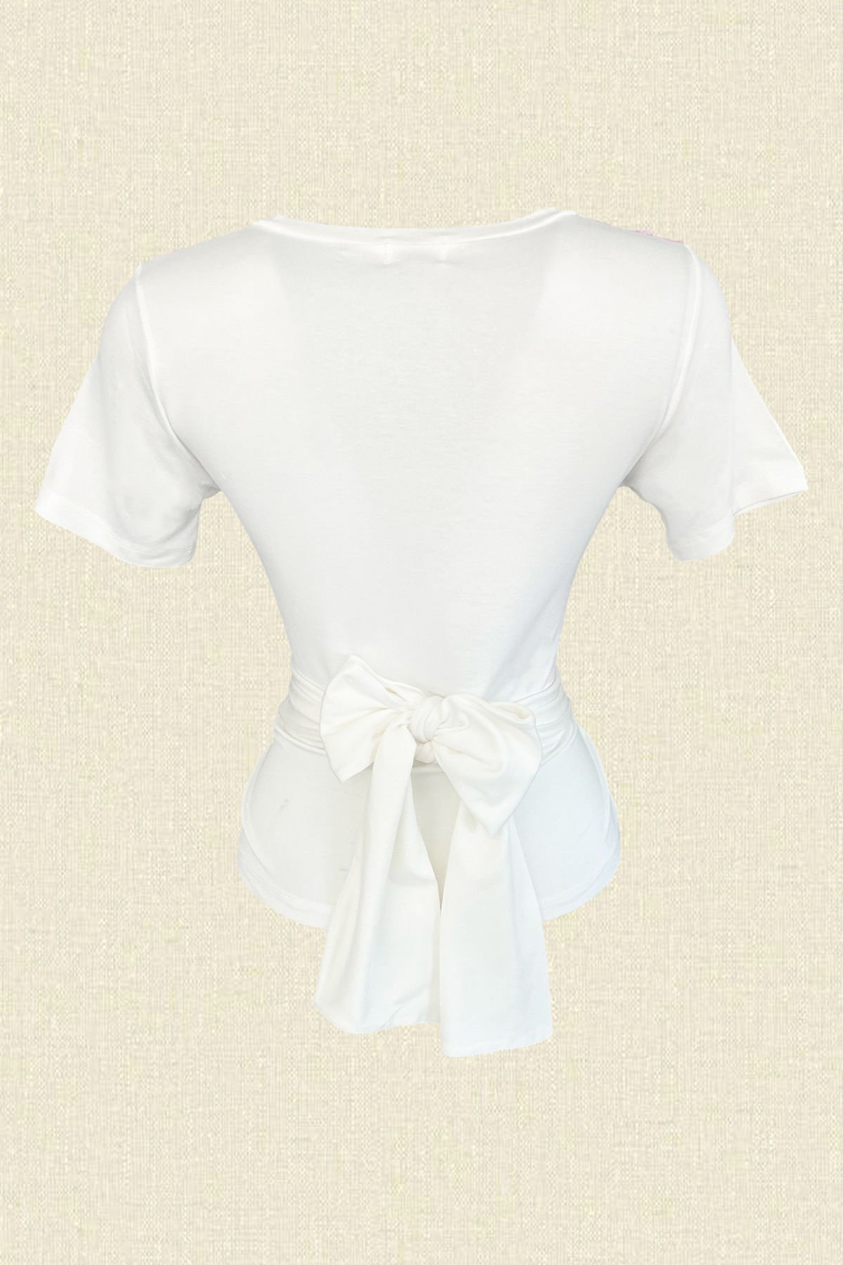 Yakasında renkli boncuklardan çiçek işlemesi bulunan, bağlama detaylı likralı beyaz bluz.