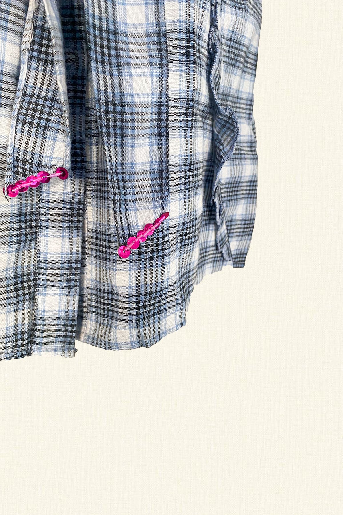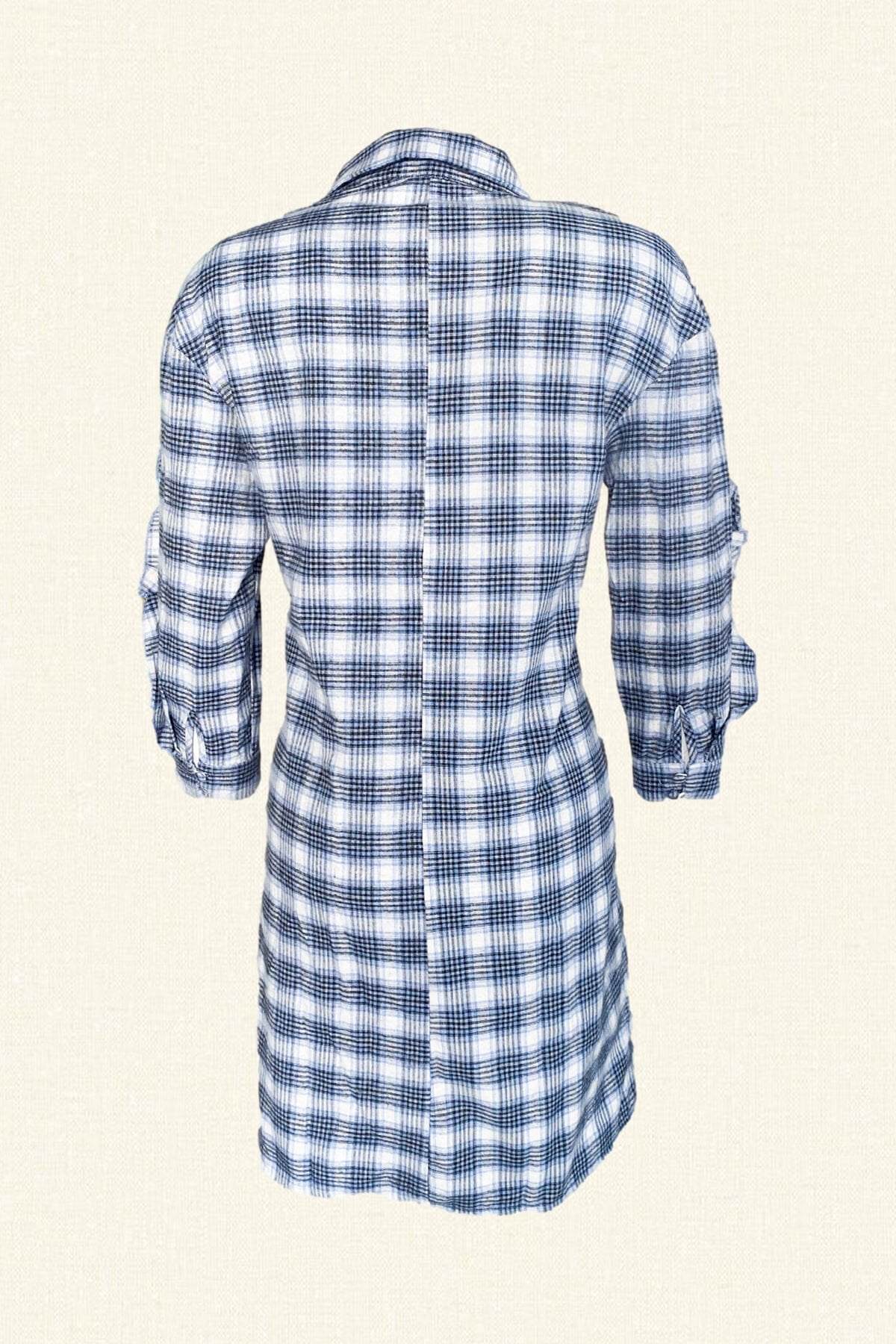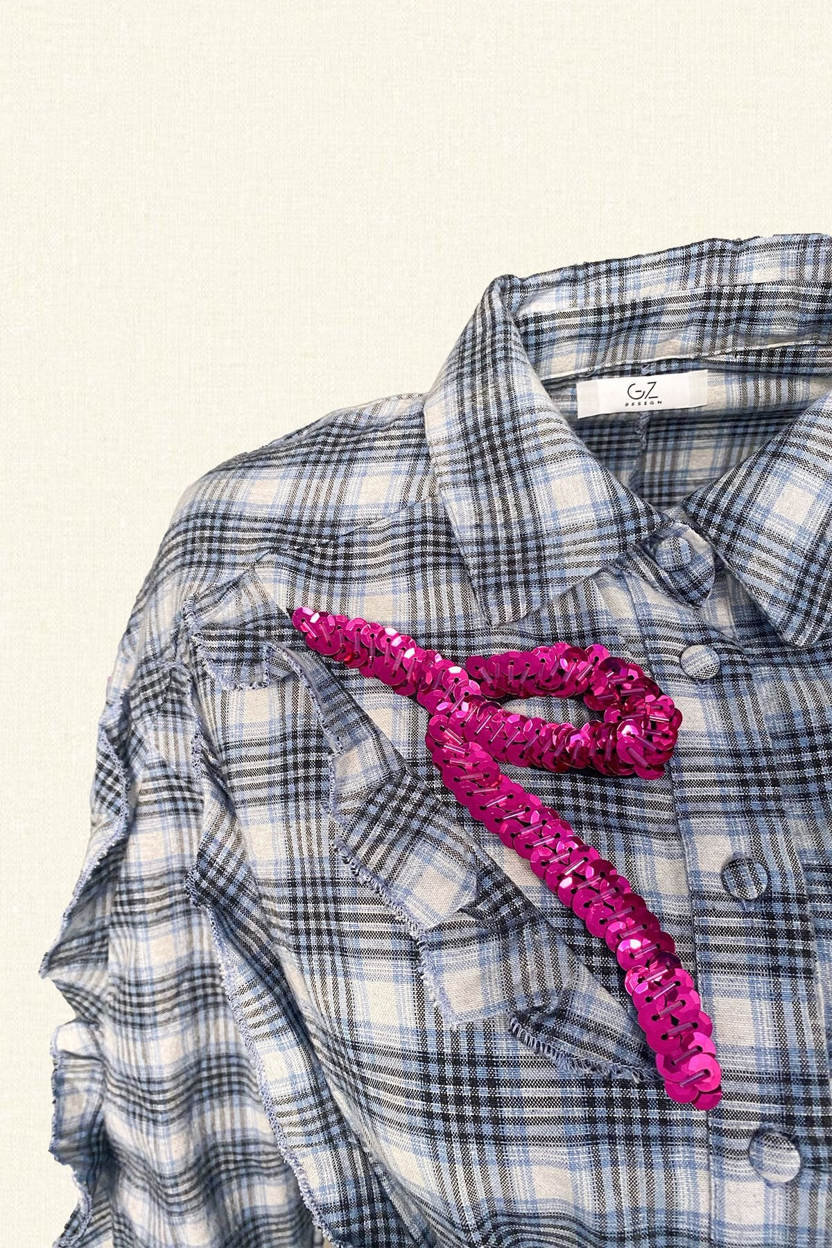 Yaka ve kuşağının uç kısmında pembe pul ve boncuklardan işlemesi bulunan, fırfır detayları olan ekoseli mini gömlek elbise.
