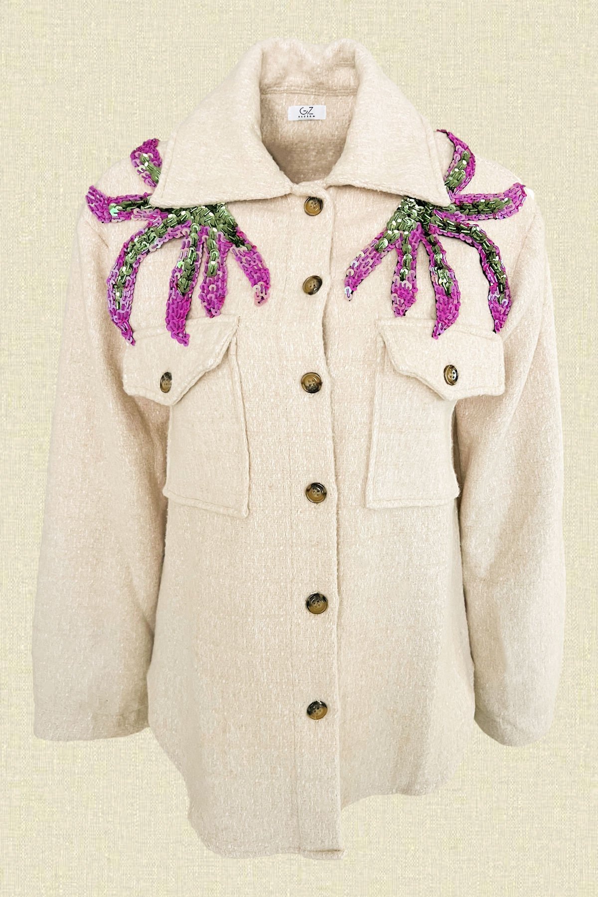 Pembe-Yeşil İşlemeli Krem Renk Yünlü Kaşe Ceket