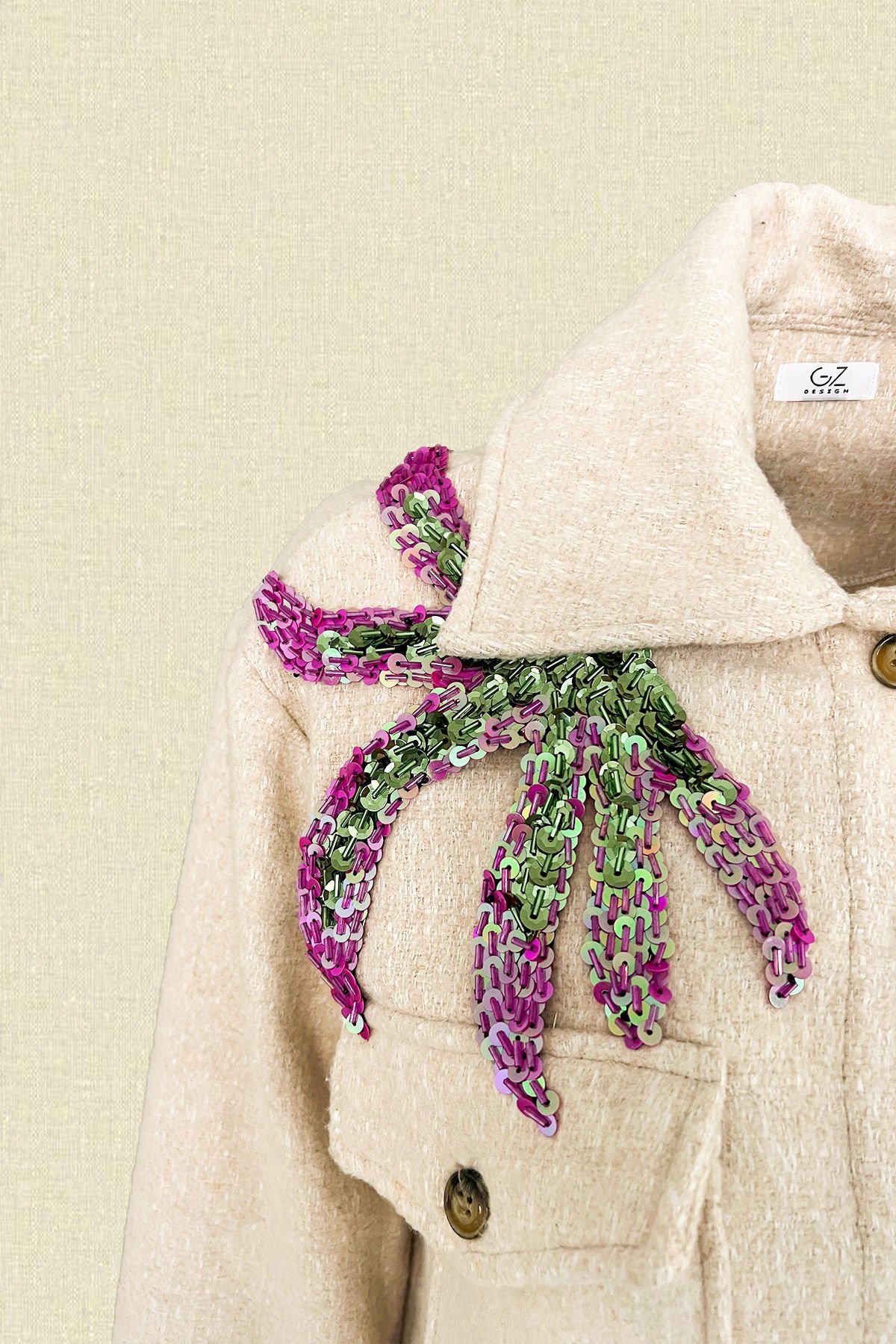 Omuzlarında pembe ve yeşil renk işlemesi bulunan, ekru renk, düğmeli, oversize yün ceket.