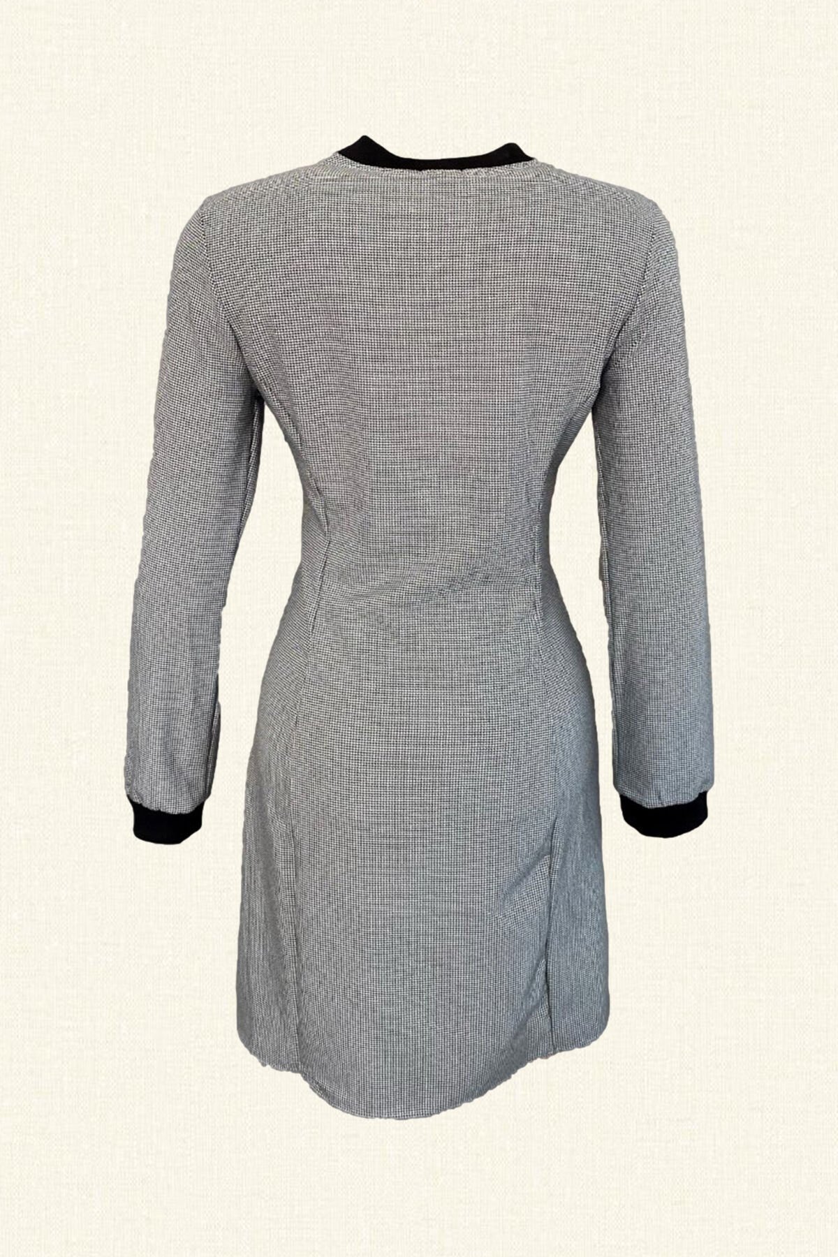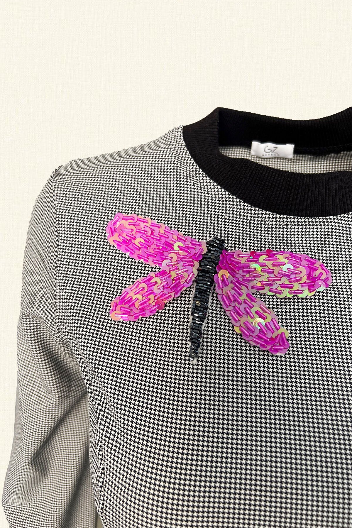Yakasında boncuk ve kristallerden yusufçuk işlemesi bulunan, kazayağı desenli elbise.