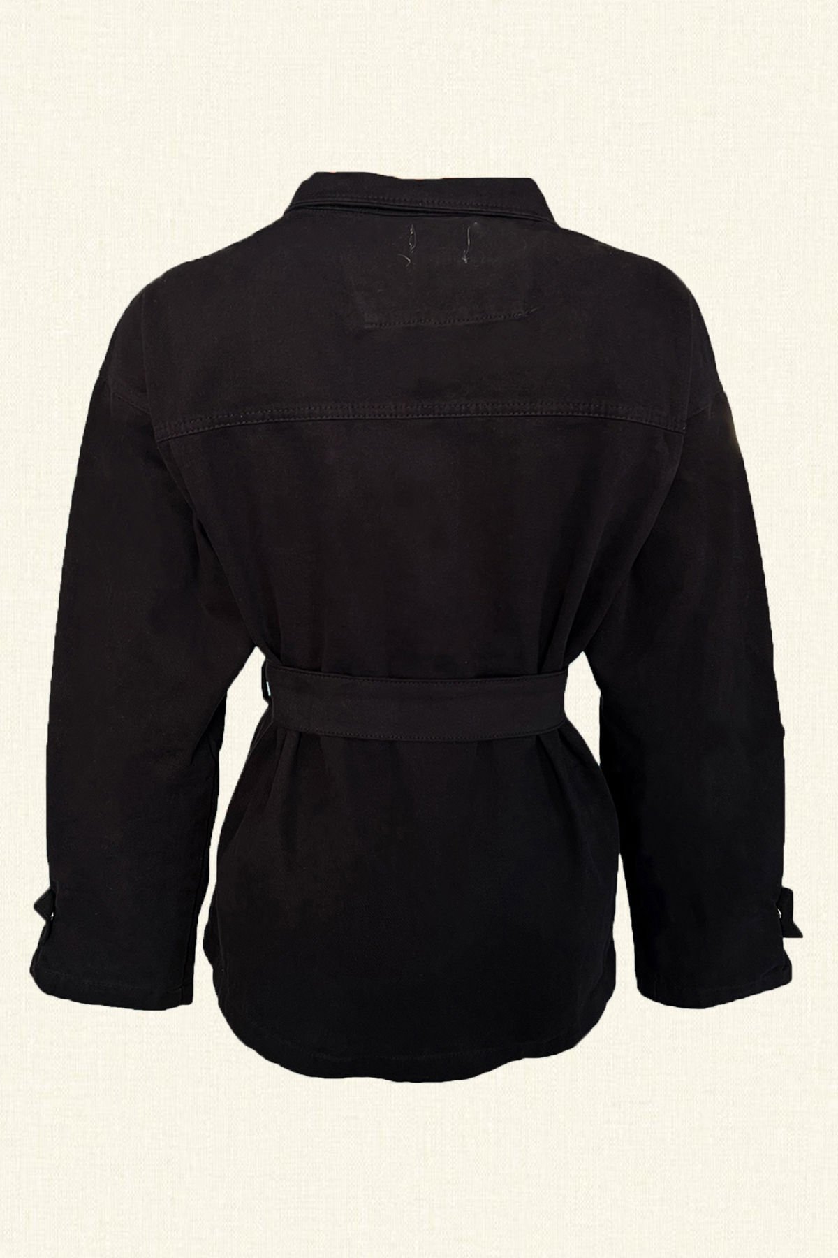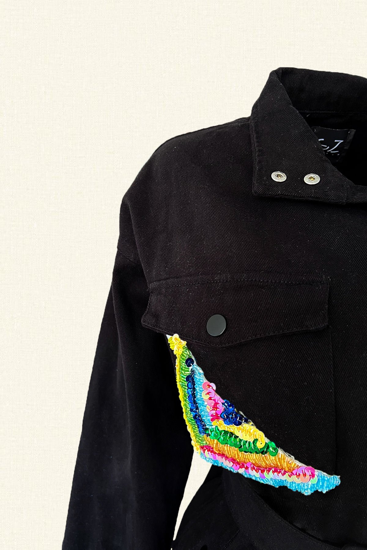 Cep kısımlarında renkli boncuk işlemeli, kemer detaylı siyah renk jean ceket.