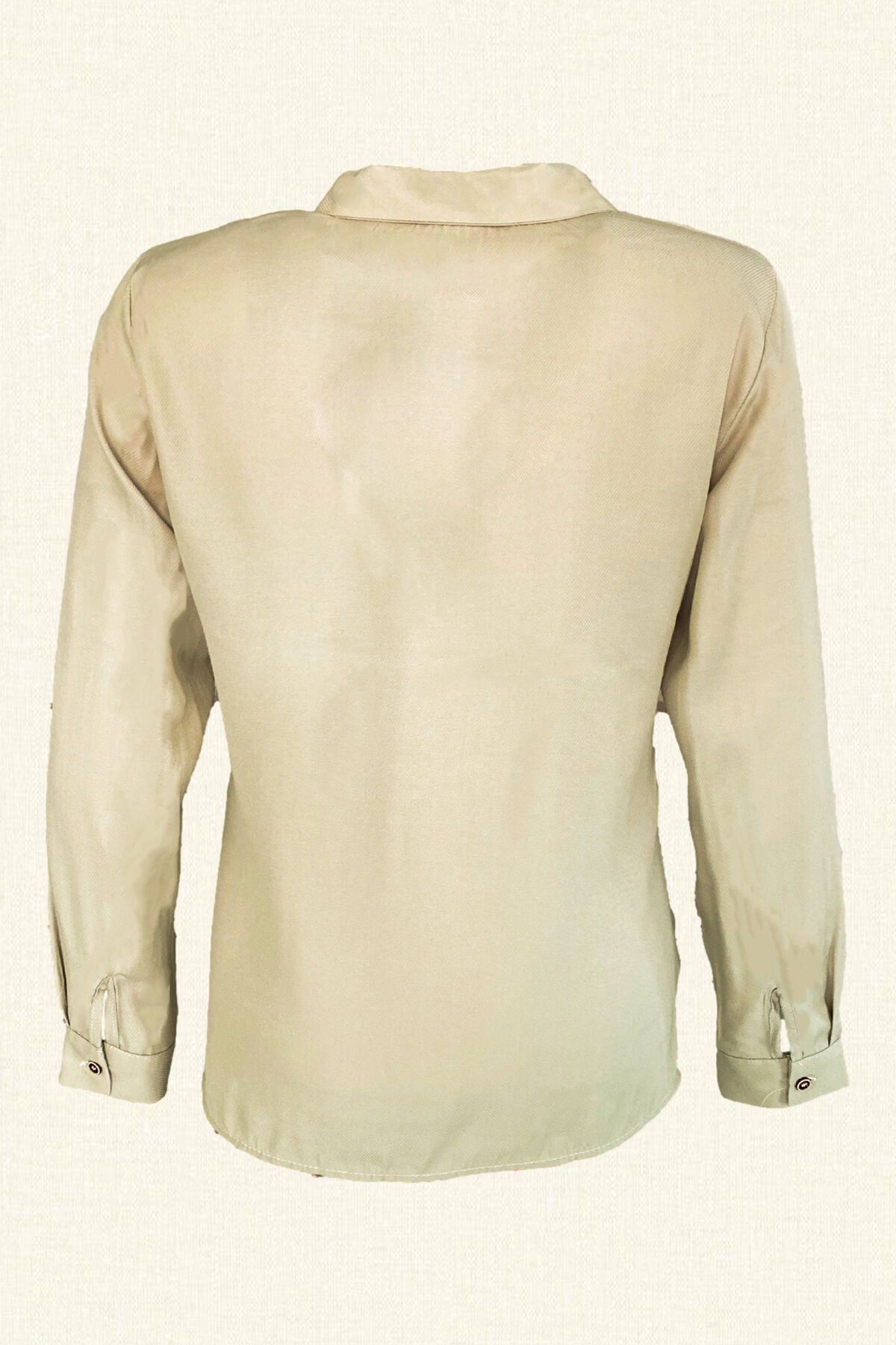 Gömleğin ön kısmında renkli boncuklardan 'BYE' işlemesi bulunan, uzun kollu taş rengi gömlek.