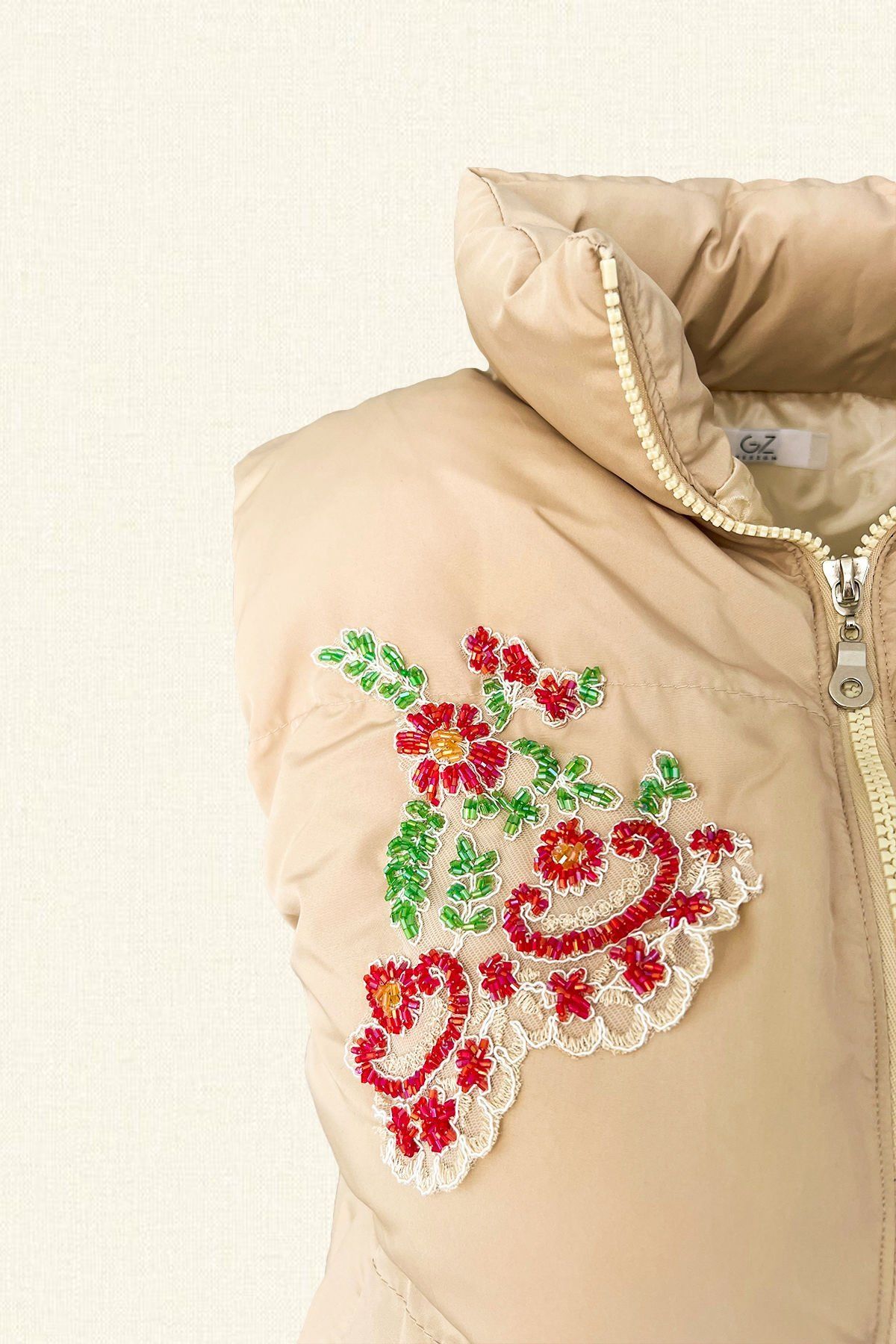 Ön kısmında renkli boncuklardan çiçek işlemesi bulunan, bomber krem şişme yelek.