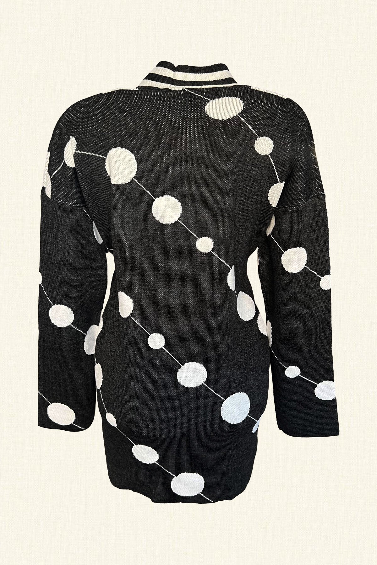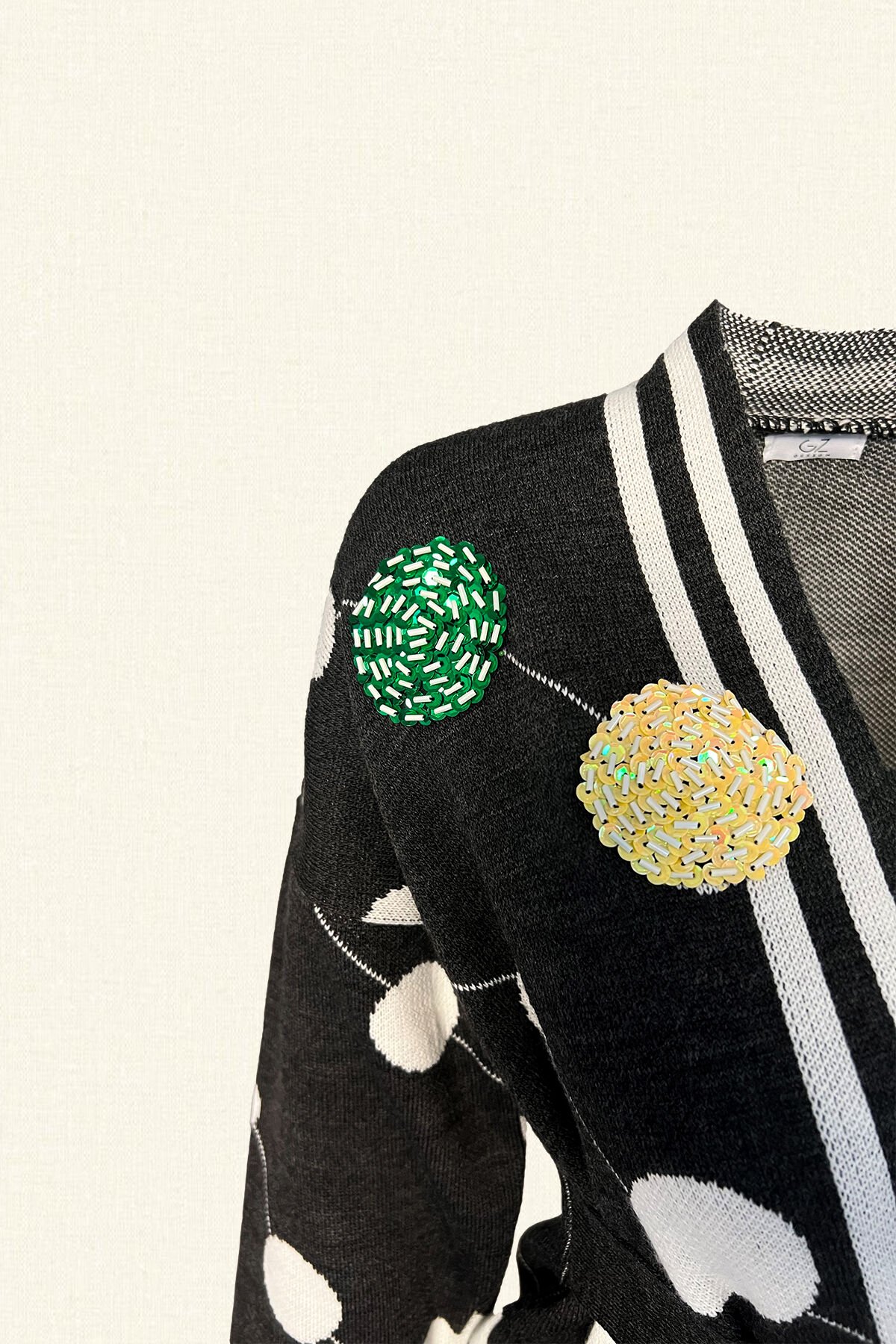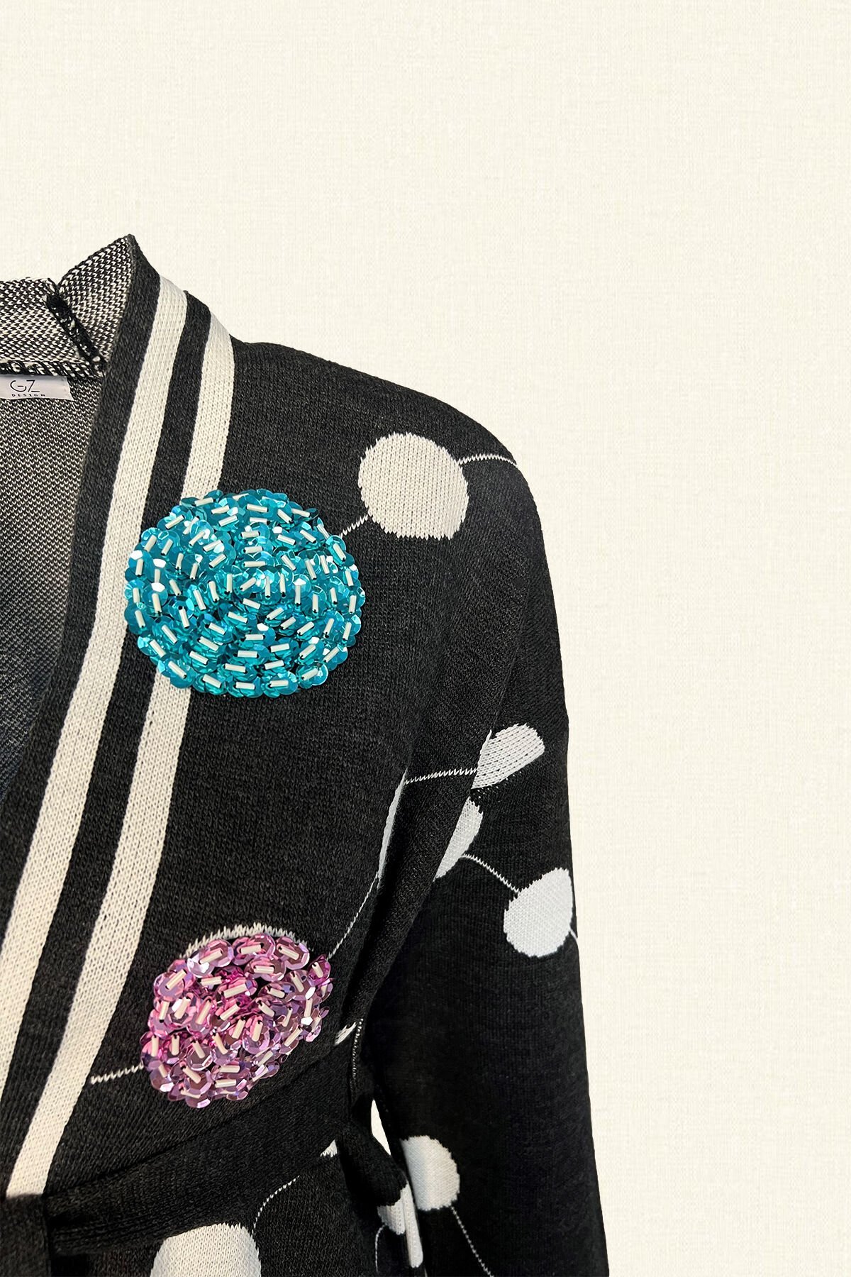 Ön kısmında renkli pul ve boncuklardan işlemesi bulunan, bağlama detaylı, puantiye desenli, füme renk triko hırka.