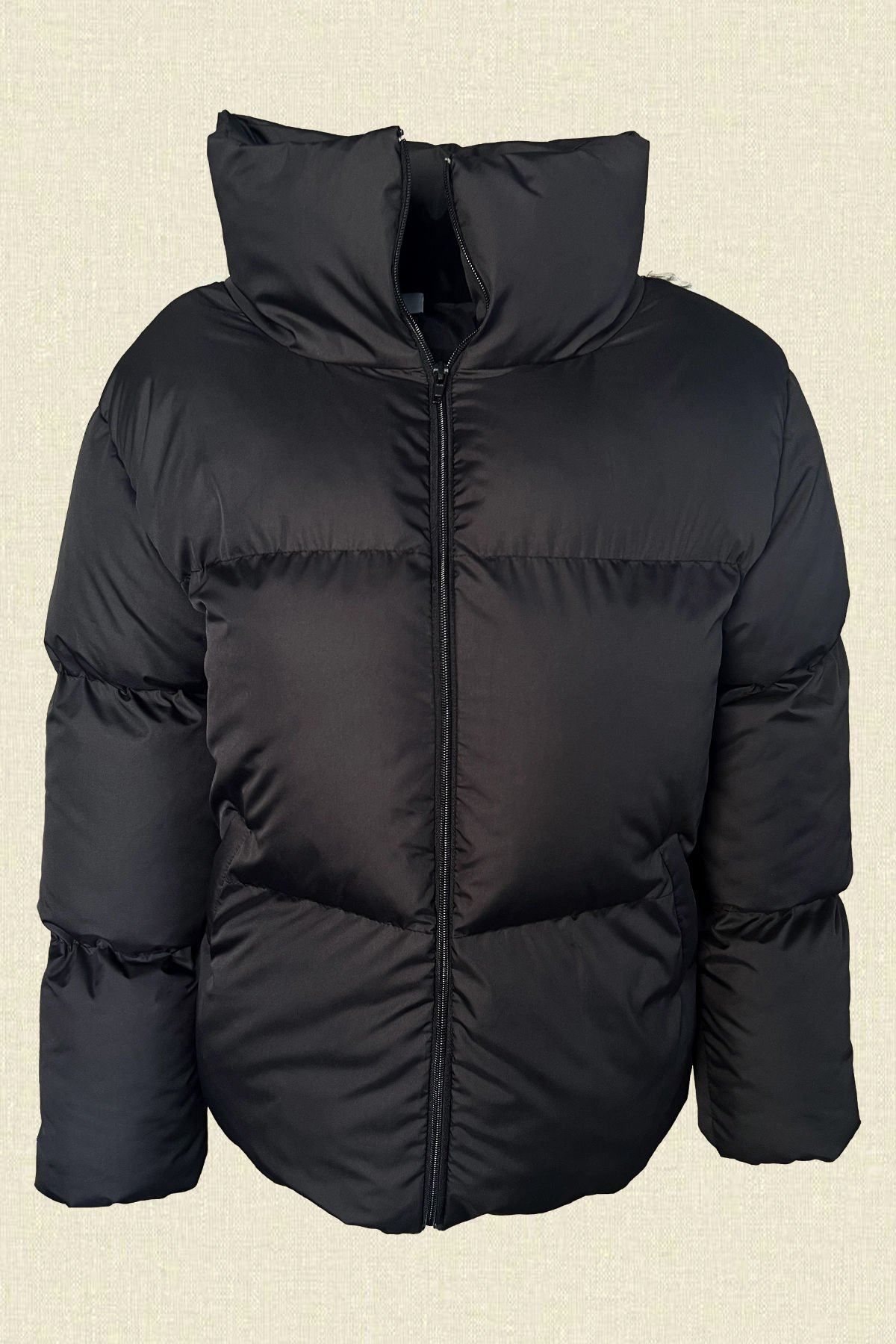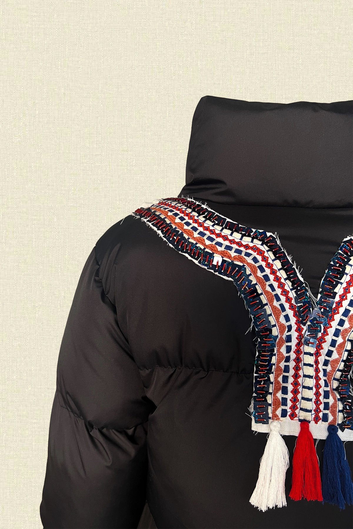 Arka kısmında kırmızı, mavi, beyaz detaylı, boncuklardan işlemesi bulunan, dik yakalı, siyah şişme mont.
