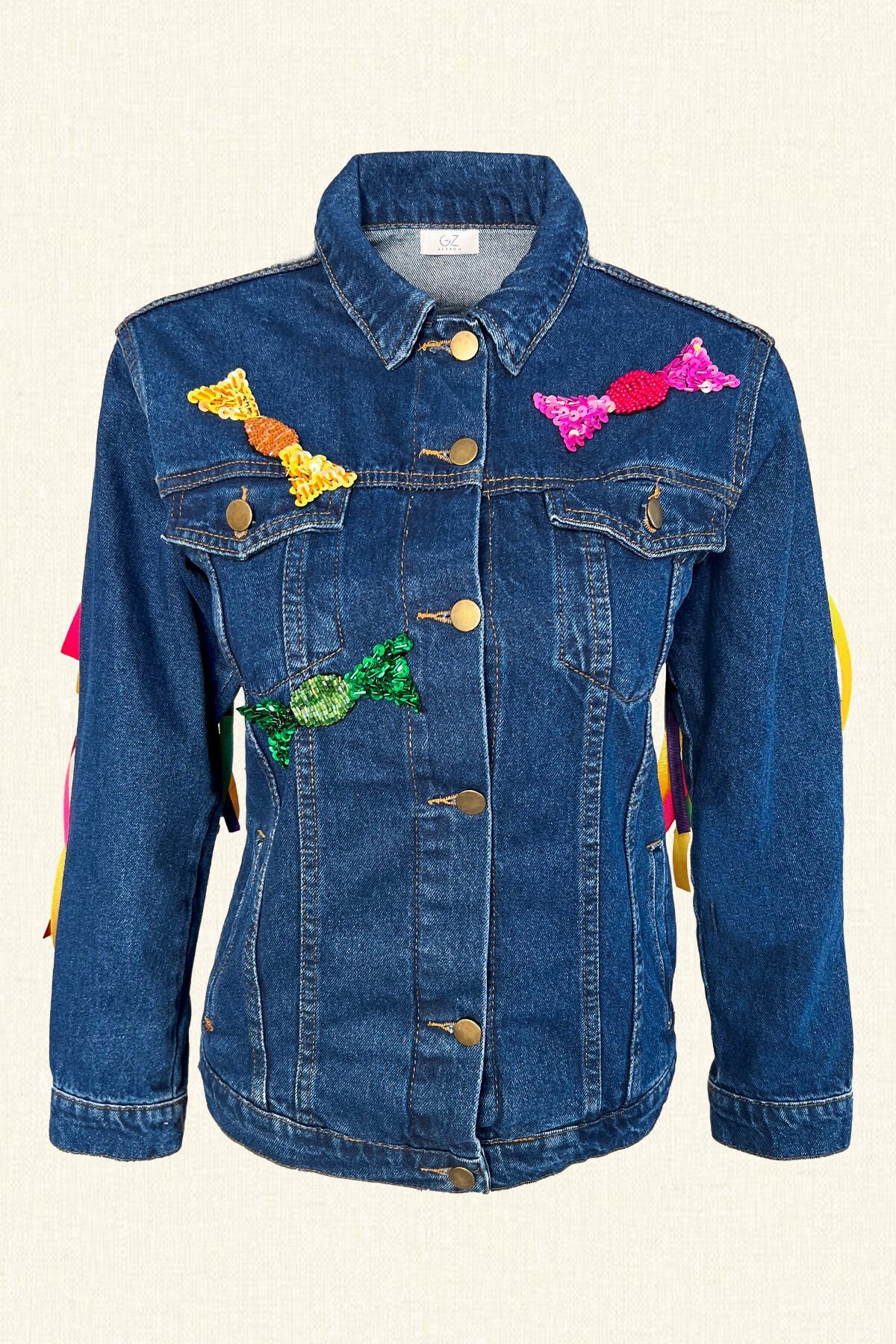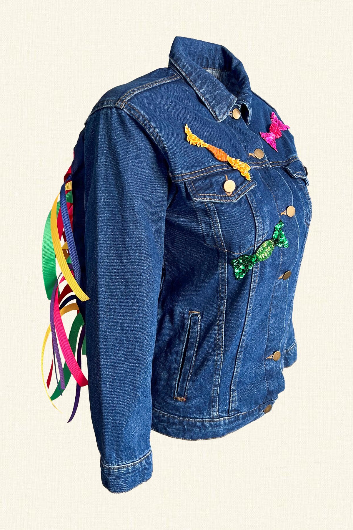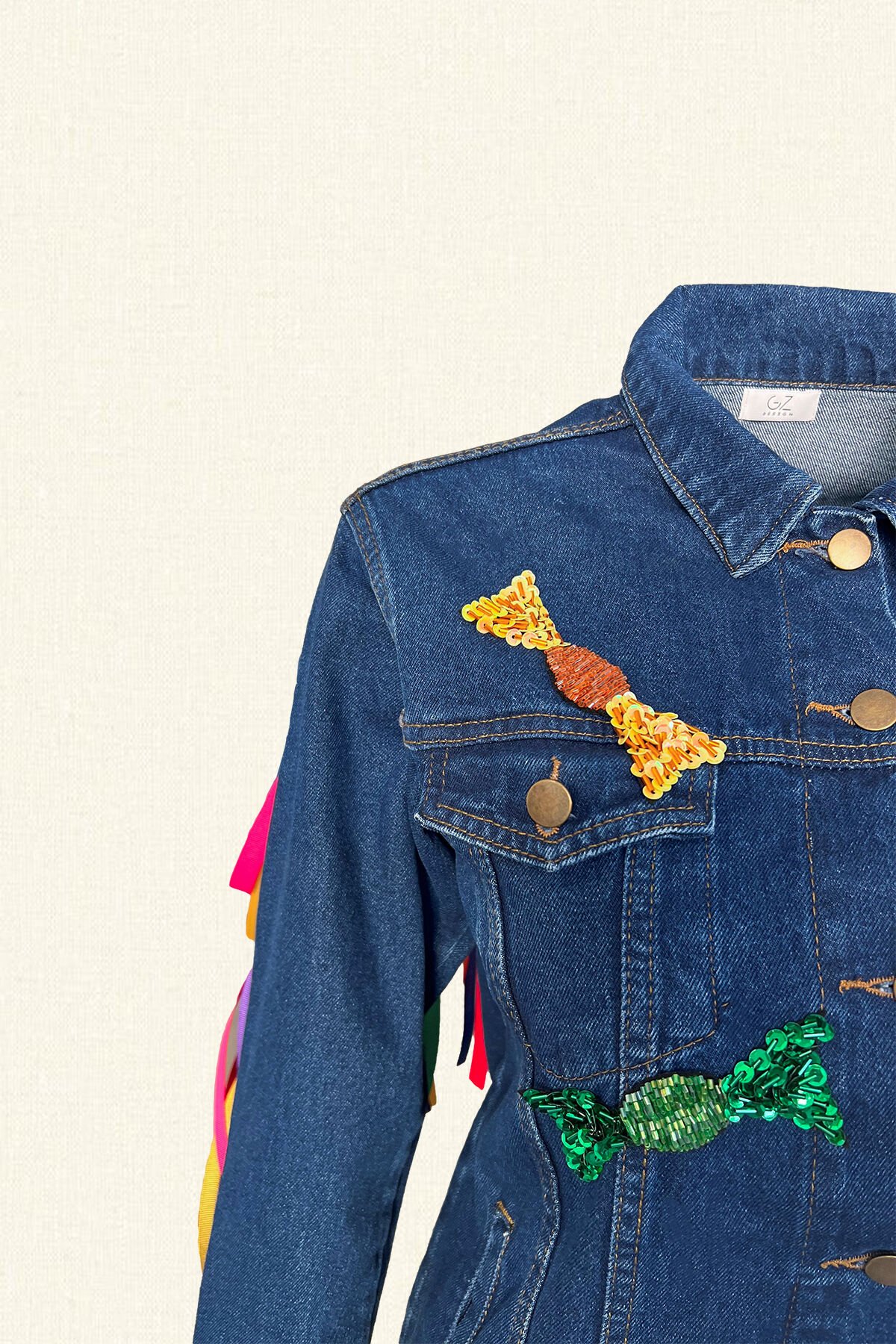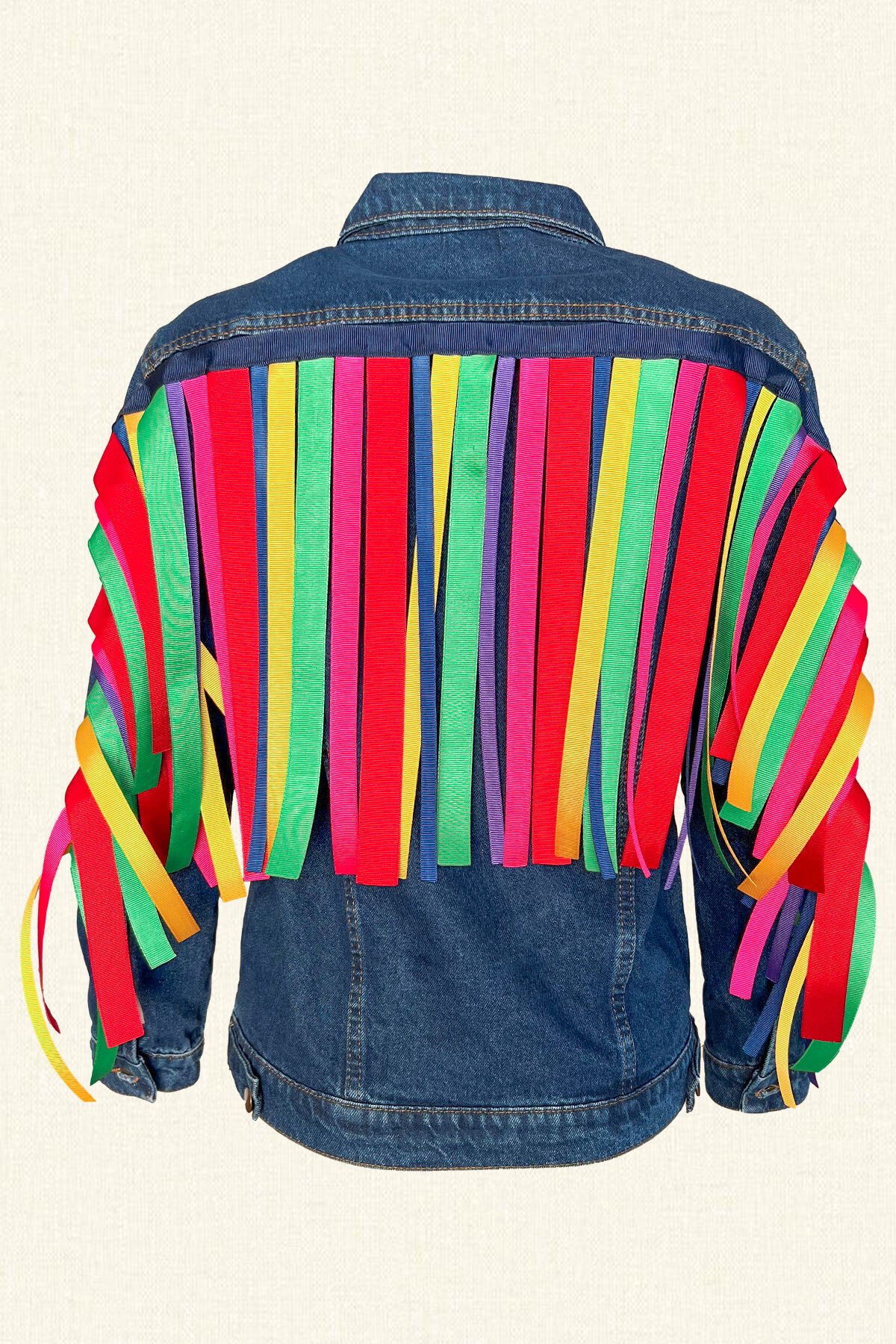 Önü renkli bonibon detaylı, sırtı renkli kurdele püsküllü jean ceket.
